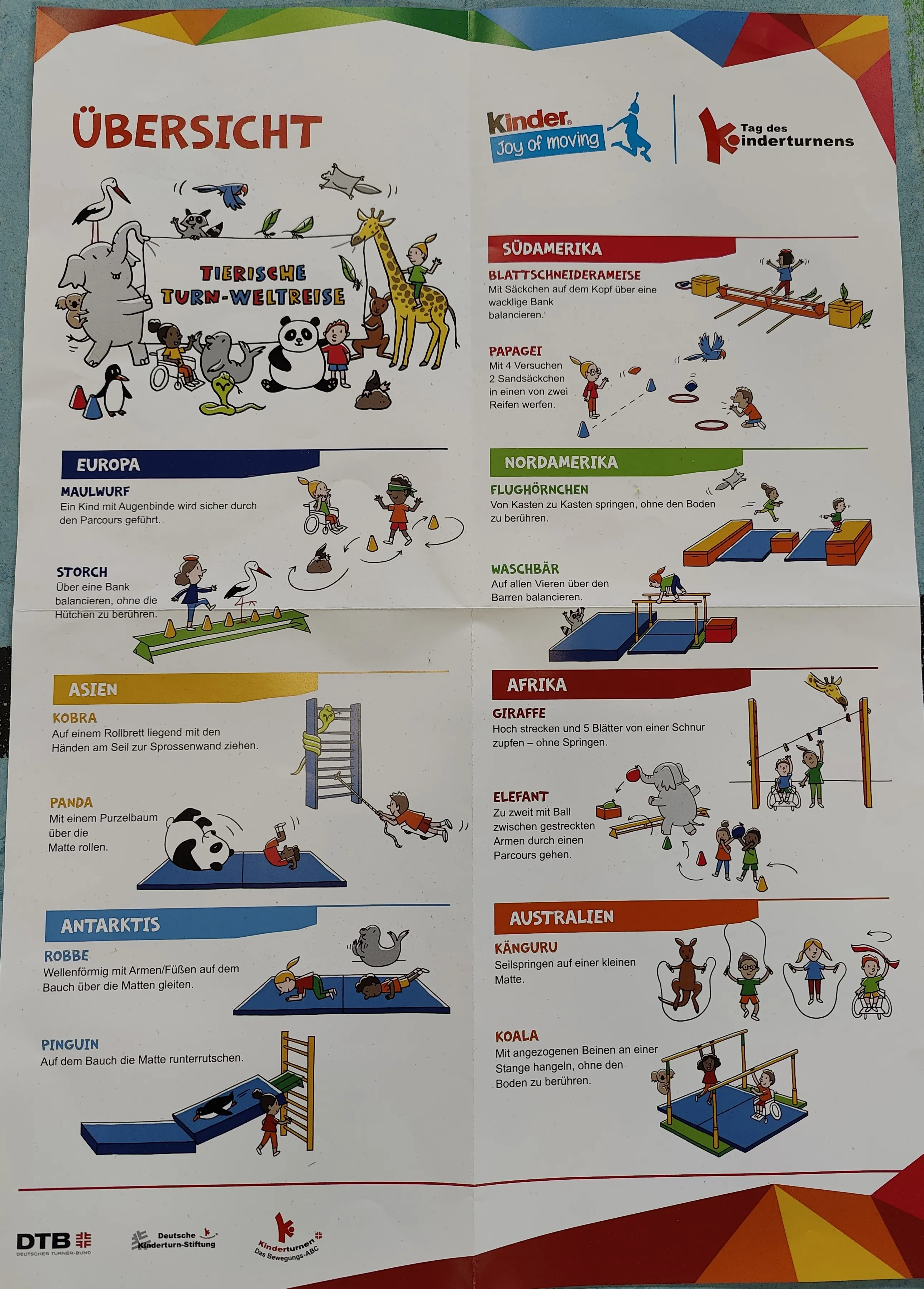 Der Deutsche Turner-Bund stellte Aufgabenempfehlungen zur Verfügung: Eine Reise um die - je nach Zählweise - sieben Kontinente, orientiert mit Tieren. Mit je zwei Aufgaben pro Kontinent gab es in Summe 14 Stationen, an denen die Kinder Turnen konnten: eine „tierische Turn-Weltreise“