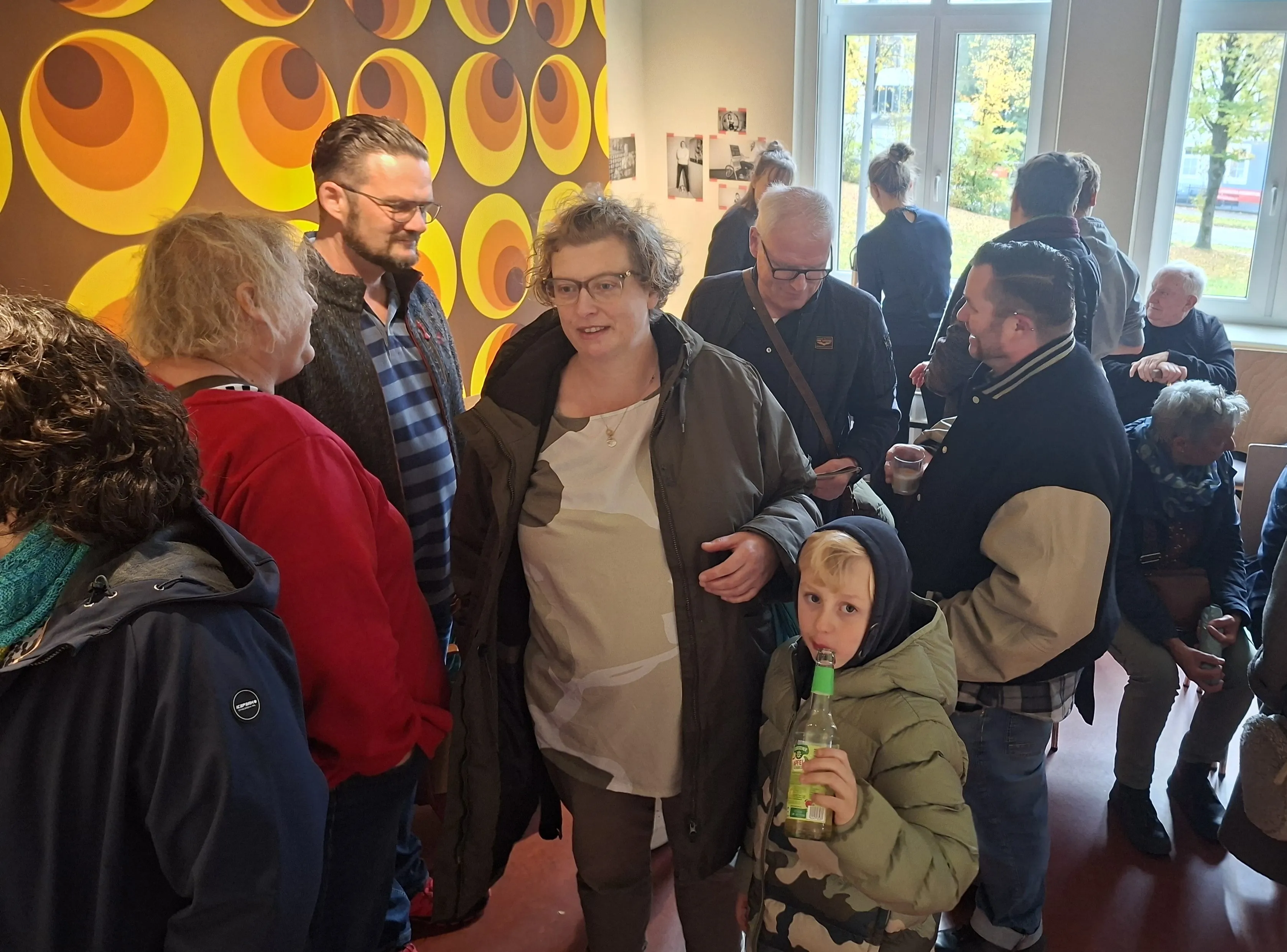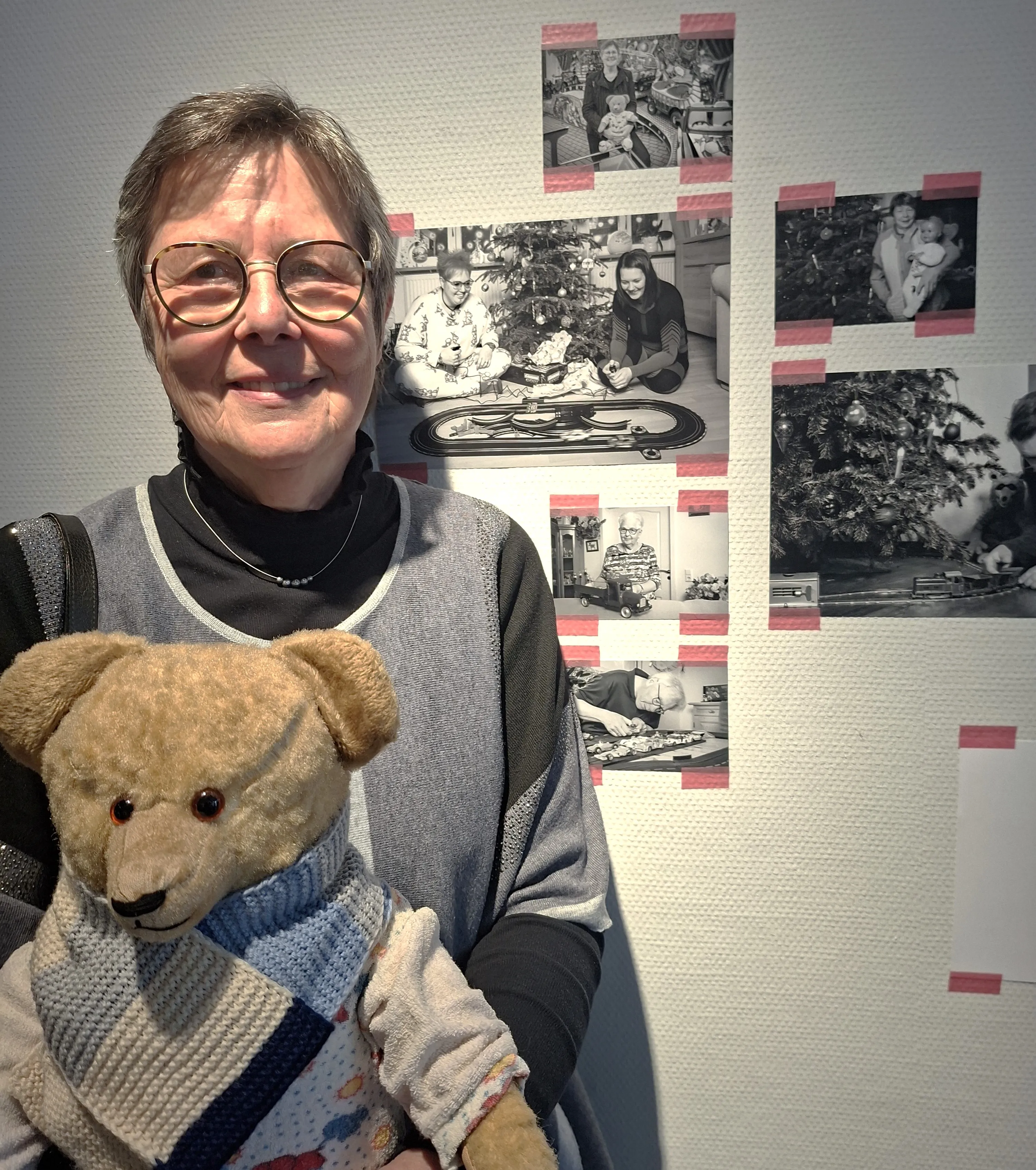 Nach der offiziellen Eröffnung konnten sich die Besucher noch lange nicht von den ausgestellten Fotos und den dazugehörigen Geschichten, die alle per QR-Code, der abrufbar neben den Bildern hängt, trennen. Immer wieder fiel ein "Weißt du noch....", oder "Ich hatte auch so einen Teddy (eine Carrera-Bahn, eine Puppe, ein Legospiel.....)". Gerade die Möglichkeit, die Erinnerungen hinter den Fotos über diese technische Möglichkeit zu hören, macht die Ausstellung besonders wertvoll. Da geht es um den "Häsimorgenstern", der nicht mit in den Urlaub durfte, sondern vor der Abreise in den Kronleuchter gehängt wurde. Es wird von der Lieblingspuppe erzählt, die während eines Kriegsangriffes im Schutzkeller zurückgeblieben war und von einem russischen Gefangenen gefunden und dem Kind zurückgegeben wurde. Es geht um nächtelanges, gemeinsames Carrera-Bahn-Spiel mit dem Papa oder die Suche nach dem Lieblingsspielzeug auf dem Dachboden.