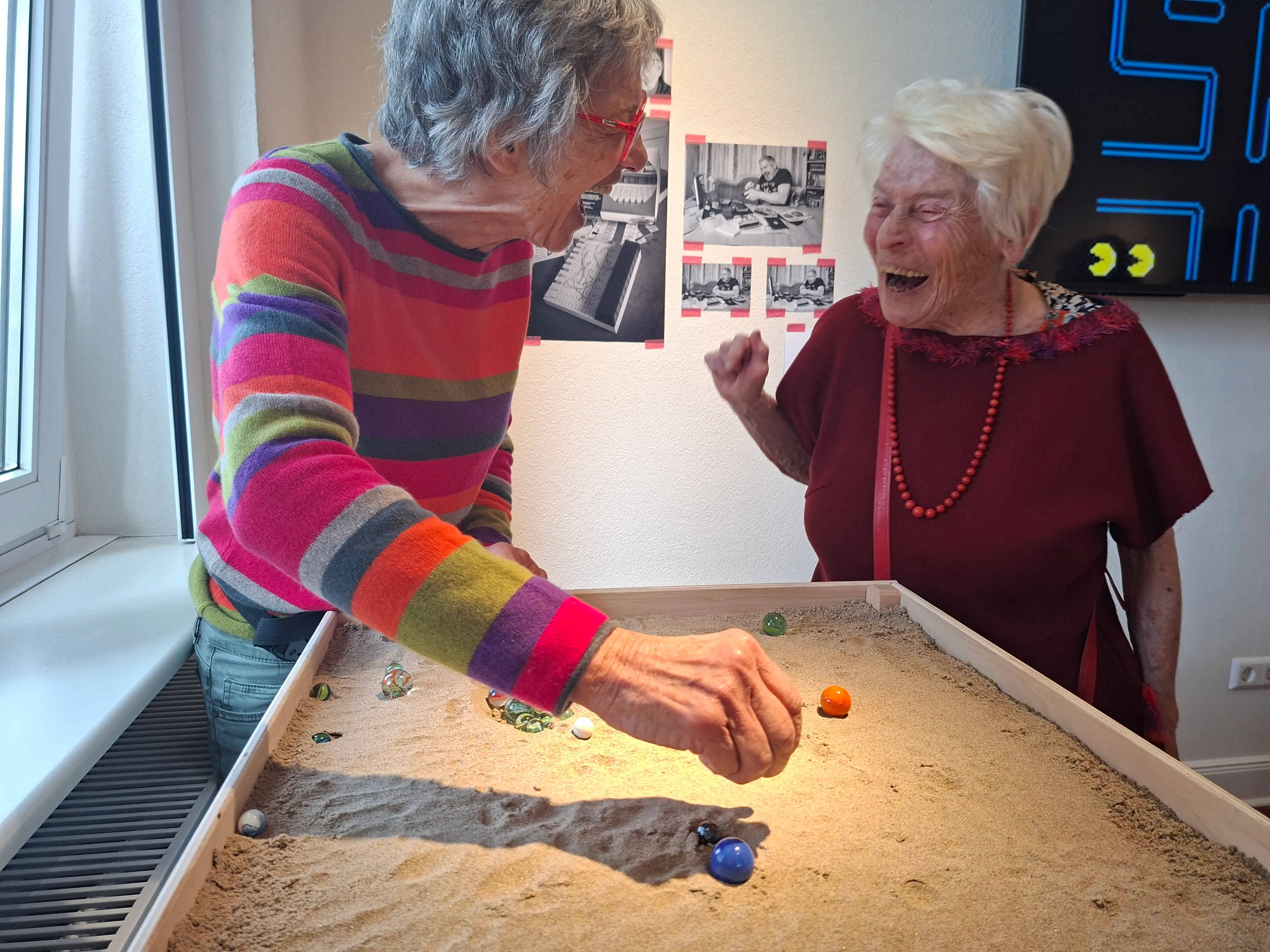 Dass einige der Ausstellungsstücke sogar zum Spielen einladen, macht die Ausstellung perfekt. Vor allem die Sandkiste mit den Murmeln hat bei den Besuchern jeden Alters Begeisterung entfacht. Auch Annalena Kibbert und ihre Besucherin, die sie mit in die Ausstellung gebracht hat, mussten austesten, wie gut sie das Spiel noch beherrschen.