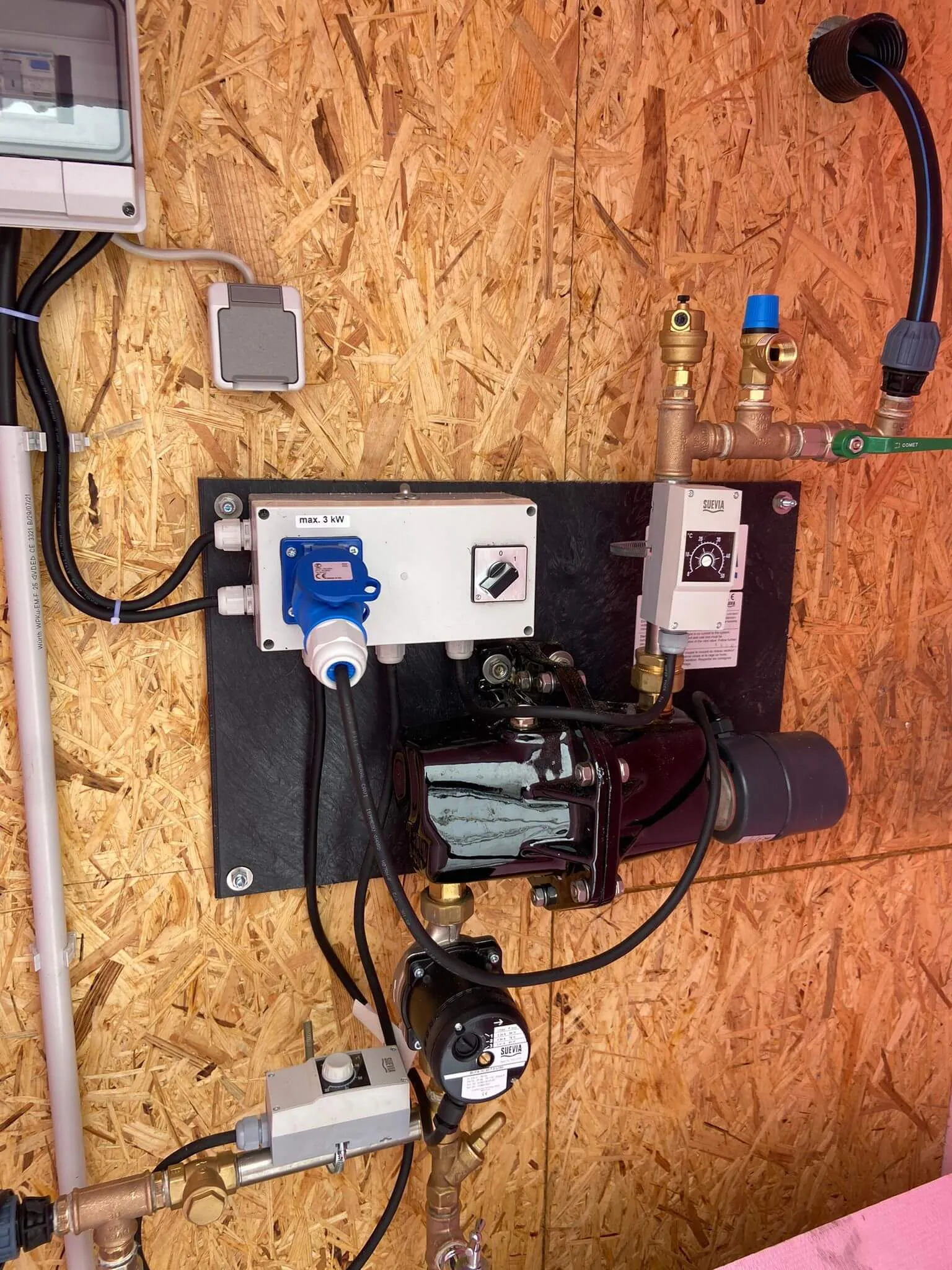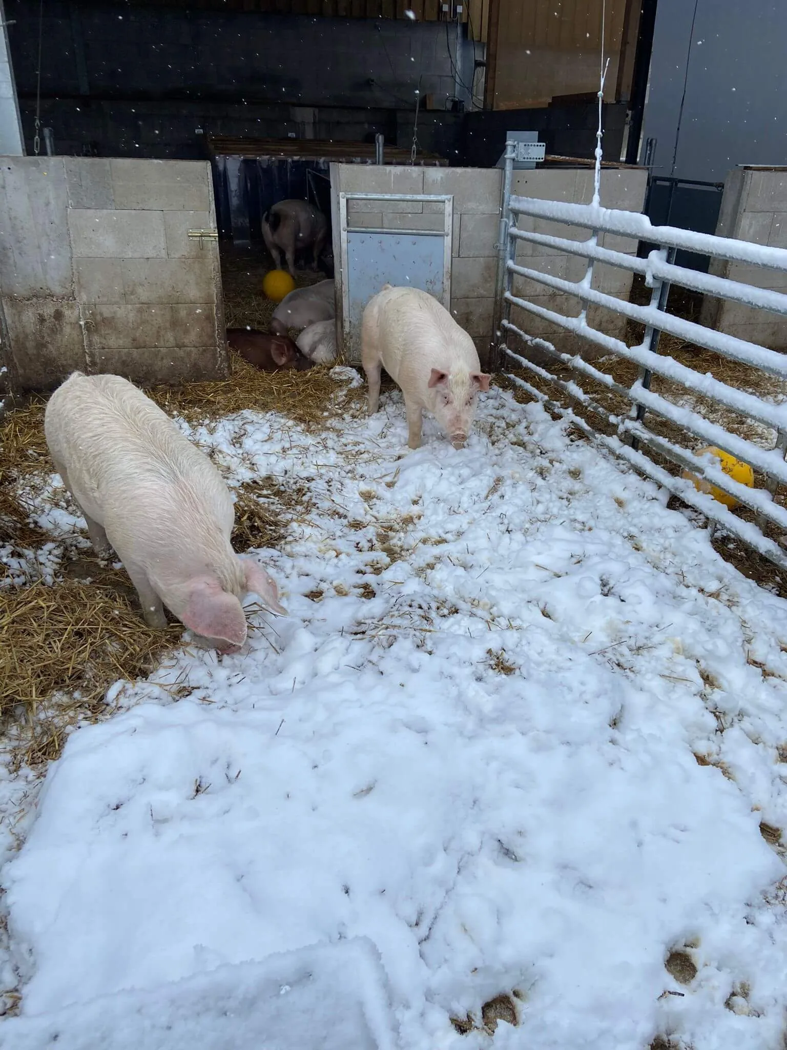 „Die Schweine können frei wählen, ob sie im Stall bleiben oder an die frische Luft gehen und sie sind auch bei Schnee gerne draußen (s. Foto). Wobei frische Luft das Zauberwort für Schweine ist, die warmen, ammoniakgefüllten Ställe von früher gehören definitiv der Vergangenheit an. Mit einem Umlaufsystem (mit angeschlossenem Durchlauferhitzer, s. Foto) und Begleitheizungen an den Tränken ist die Wasserversorgung gesichert. Mit einer Mikroklimakiste sorgen wir für ein warmes Nest: Eine große Holzkiste ist oben mit einer Kokosmatte isoliert und am Ausgang mit Streifenvorhängen (ähnlich wie die Fliegenvorhänge, die man vom Zelt kennt) windgeschützt – so können sich die Tiere im täglich frischen Stroh nah nebeneinander legen, um sich aufzuwärmen. Dank dieser Ausstattung ist die Kälte für uns kein Problem. Auffallend ist, dass die Futteraufnahme bei Minustemperaturen deutlich höher ist.“