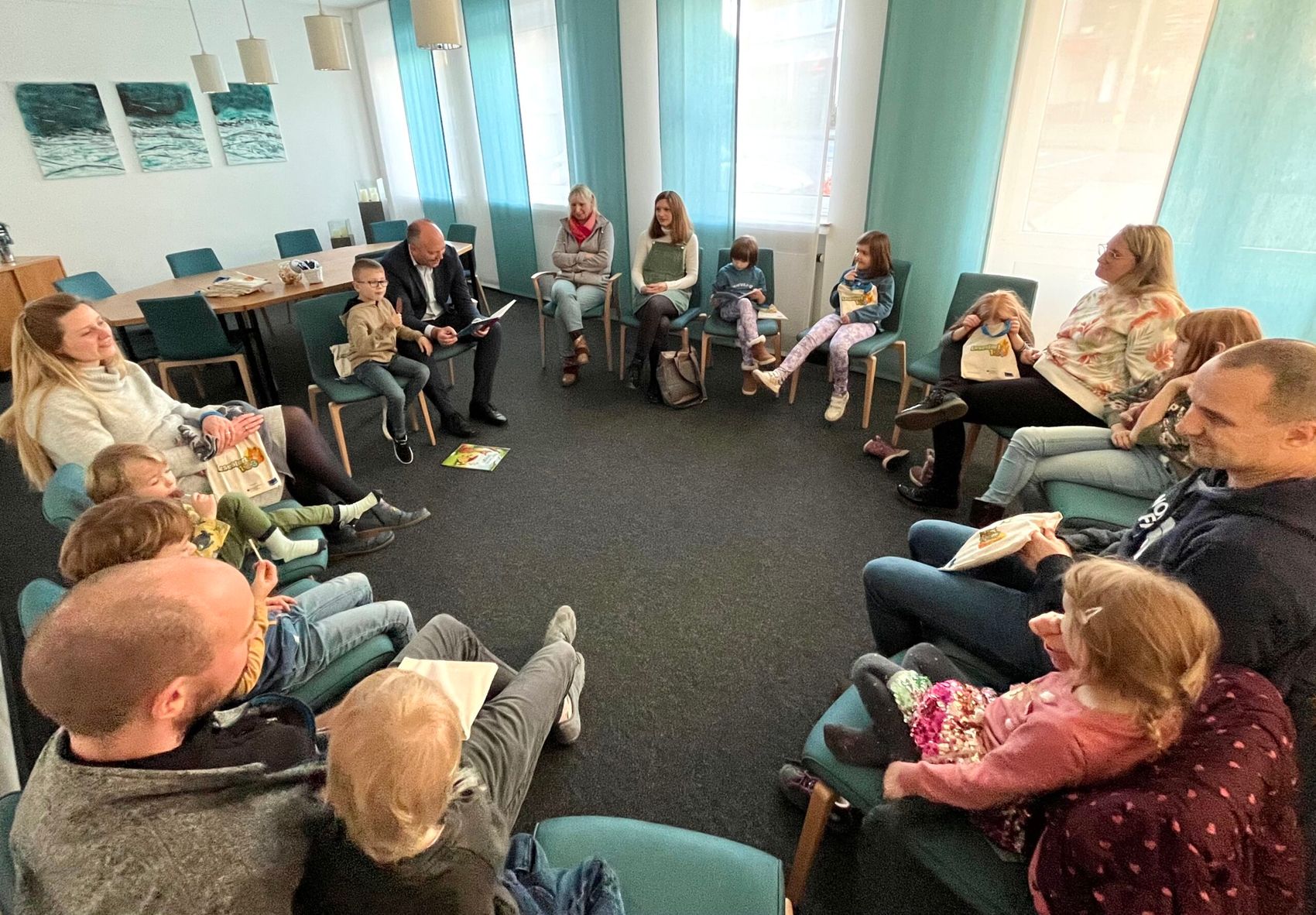 Anfangs noch aufgeregt und „ordentlich“ auf den Stühlen im Bürgerzimmer des Rathauses sitzend, konnte Vorleser André Dahlhaus den Kindern schon mit der ersten Geschichte die Scheu nehmen: Als Vater von zwei Söhnen schien der Bürgermeister geübt darin zu sein, die Spannung und jeweilige Stimmung der Vorlesegeschichten auch klangsprachlich an die Kinder weiterzugeben. Und weil die erste Geschichte eine sehr lustige war, brach auch schnell das Eis zwischen dem „Stadtchef und den zwischen vier und sieben Jahren alten Kindern.