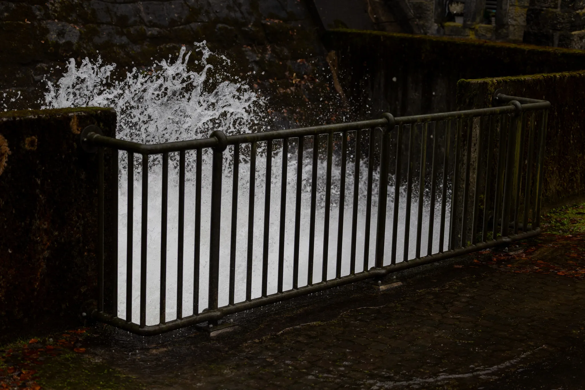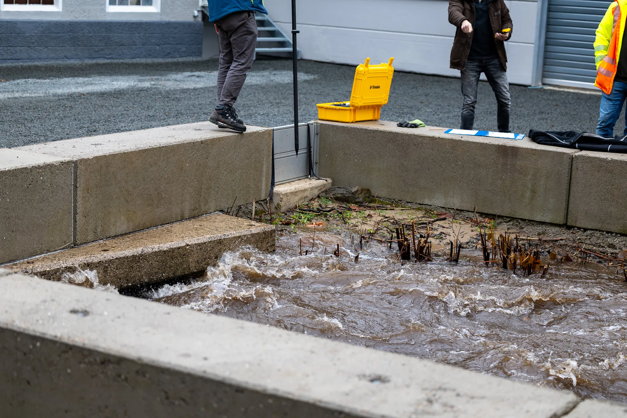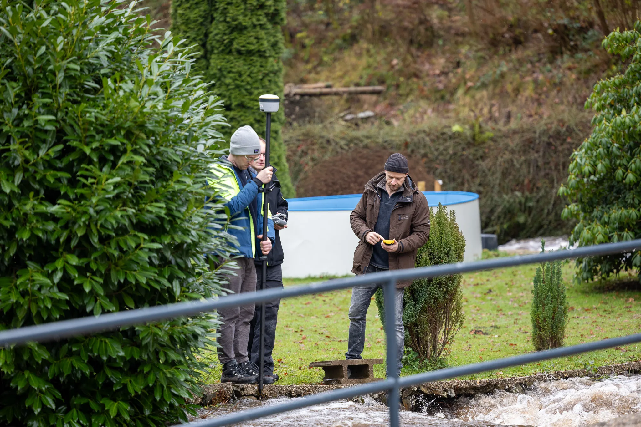 Um diese Abgabemenge zu ermitteln, wurde das Wasser der Glörtalsperre durch die Stammmauer in das Tosbecken unterhalb der Staumauer abgeleitet, von wo aus es dann weiter in die Volme floss. Die Menge wurde dabei schrittweise immer weiter erhöht — nach knapp zwei Stunden waren es 3000 Liter pro Sekunde. Ein Blick auf den Pegelstand entlang der Grundstücke an der Glörstraße verriet: Hiermit war die maximale Abgabemenge erreicht.