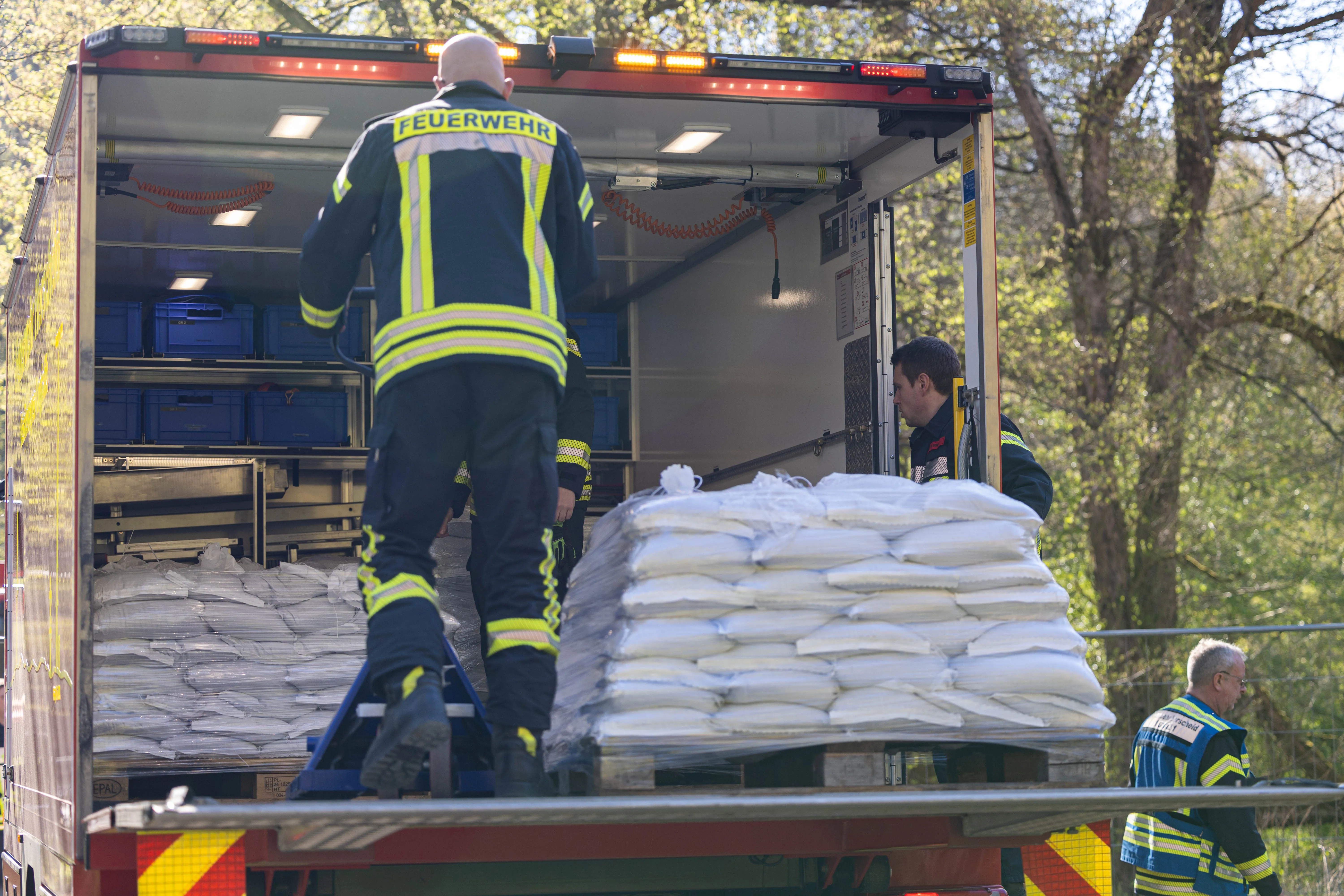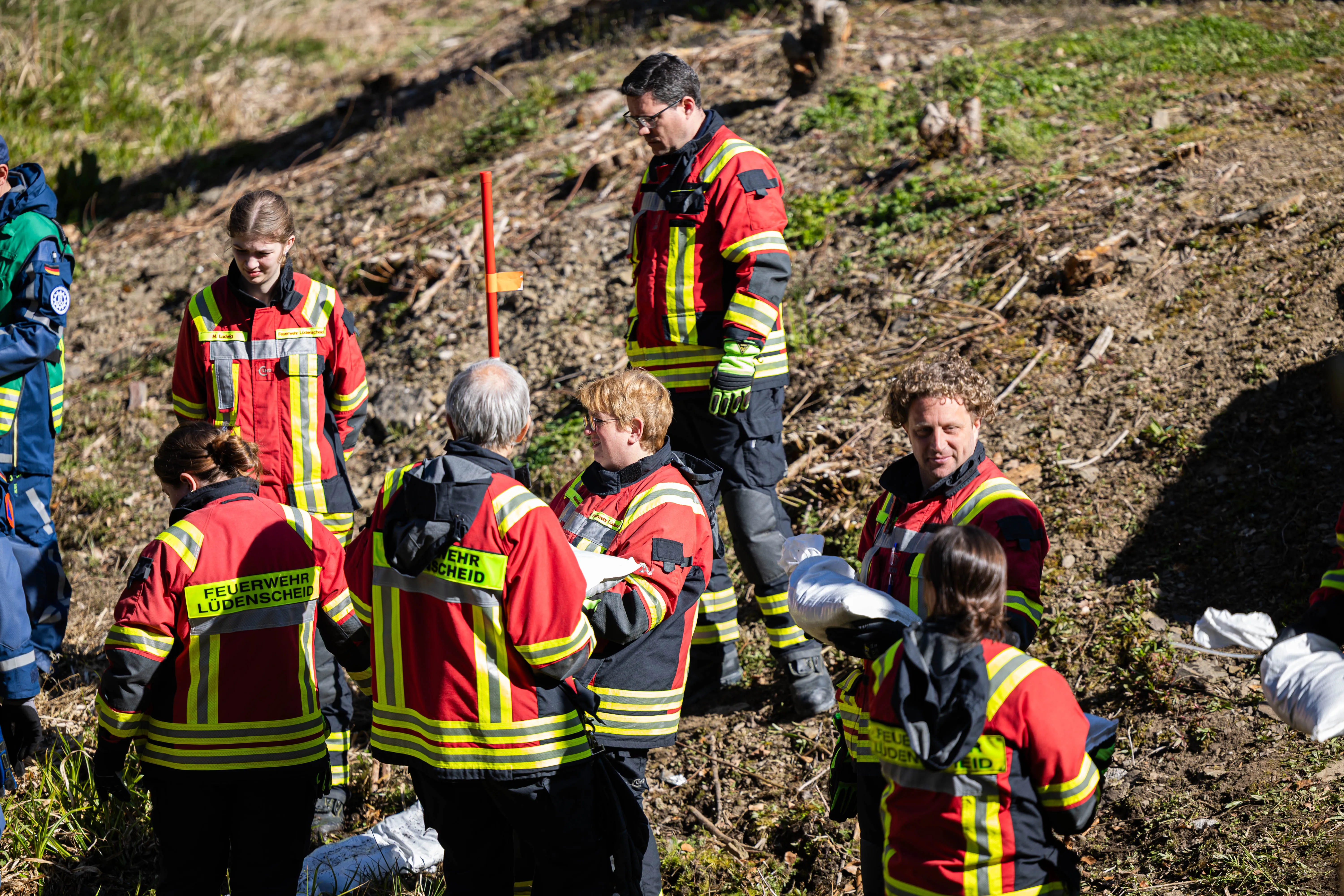 Gemeinsam errichteten die Einsatzkräfte am Bremecker Hammer einen Deich aus rund 10.000 Sandsäcken. Bereits am Freitag und Samstag waren Einsatzkräfte an mehreren Standorten aktiv, darunter in Hemer, Lüdenscheid, Altena und Plettenberg. Der Deich bleibt selbstverständlich bestehen.