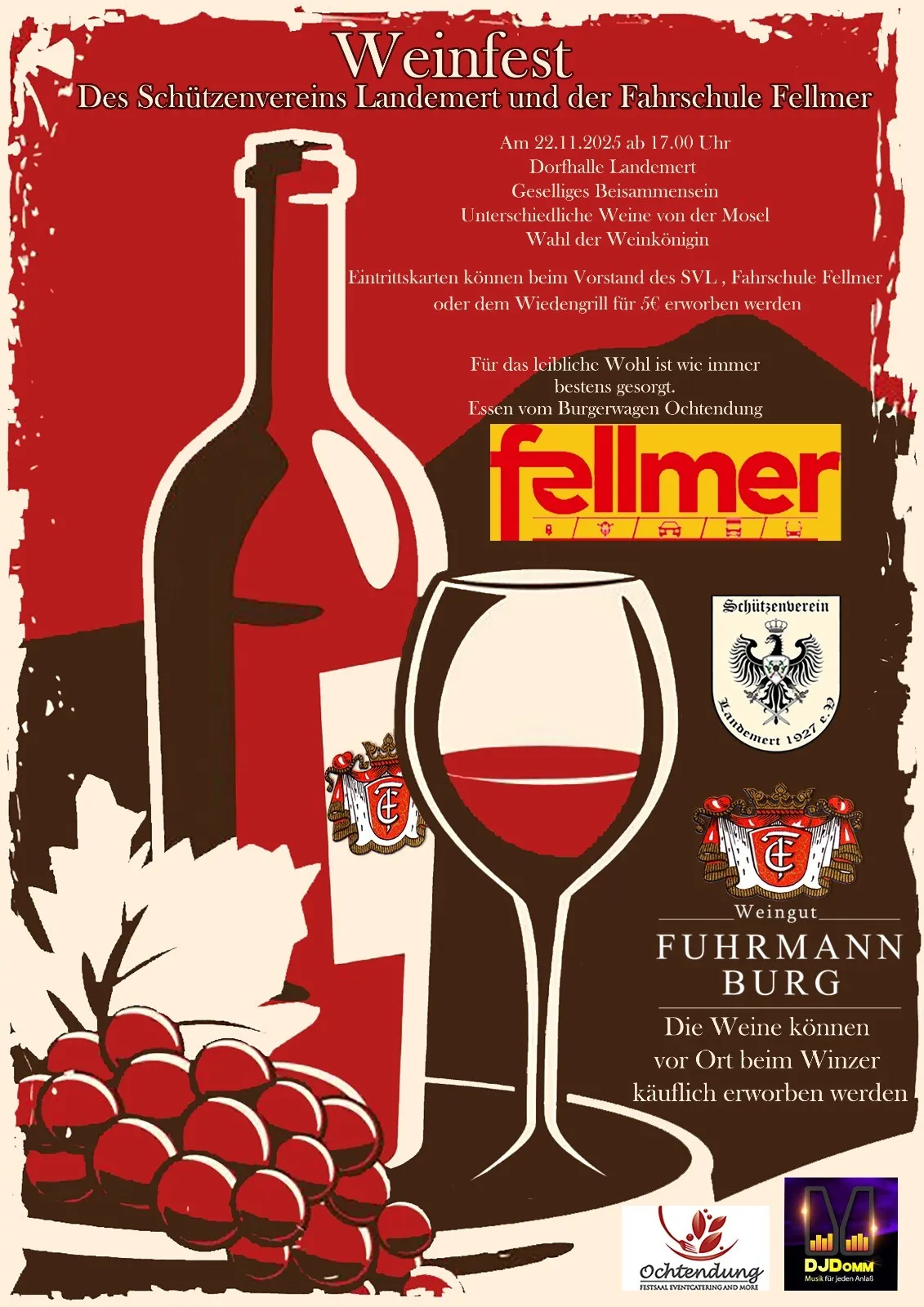 Der Schützenverein Landemert veranstaltet am Samstag, 22. November, ein Weinfest. Beginn ist um 17 Uhr in der Schützenhalle.
