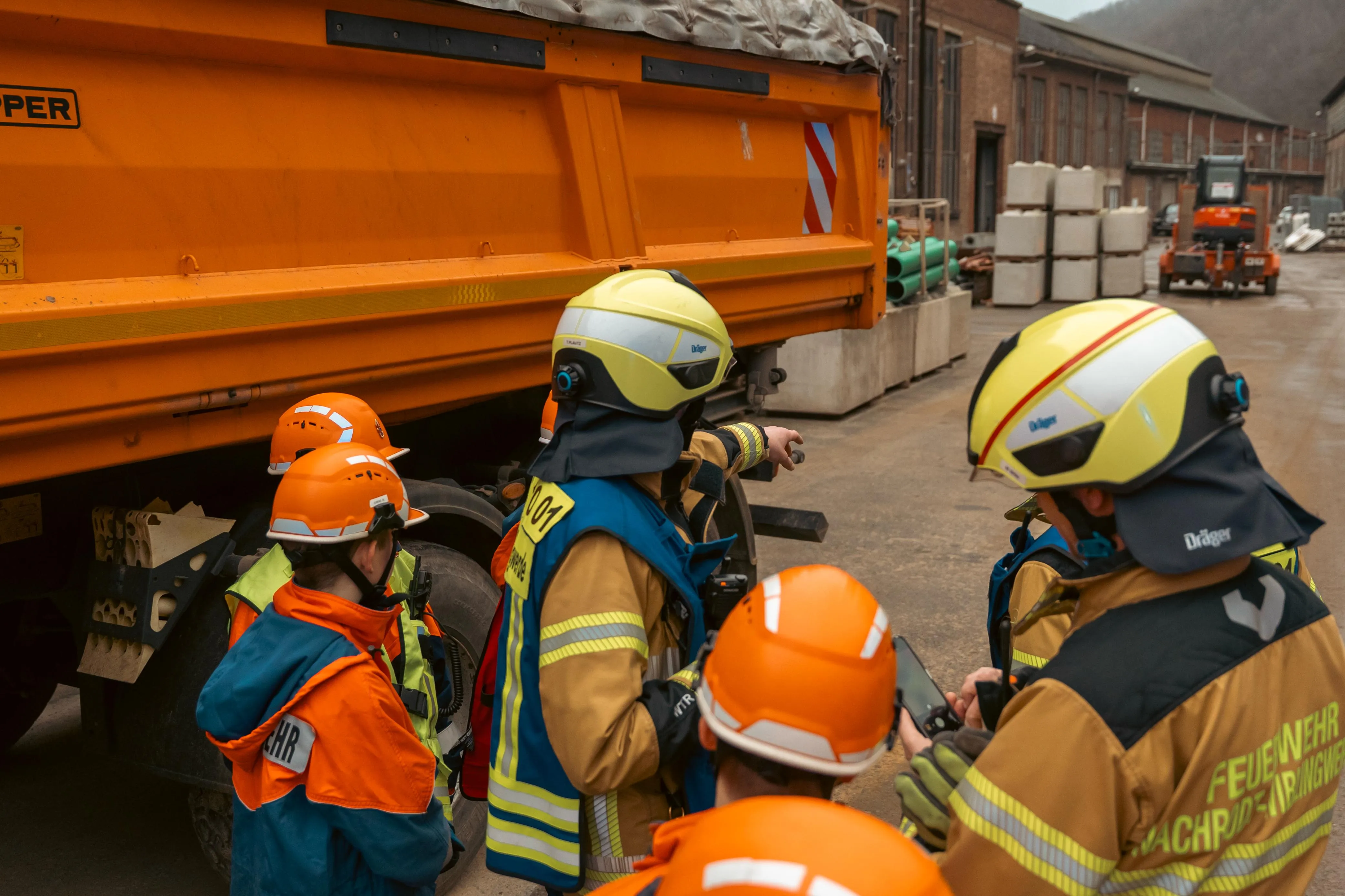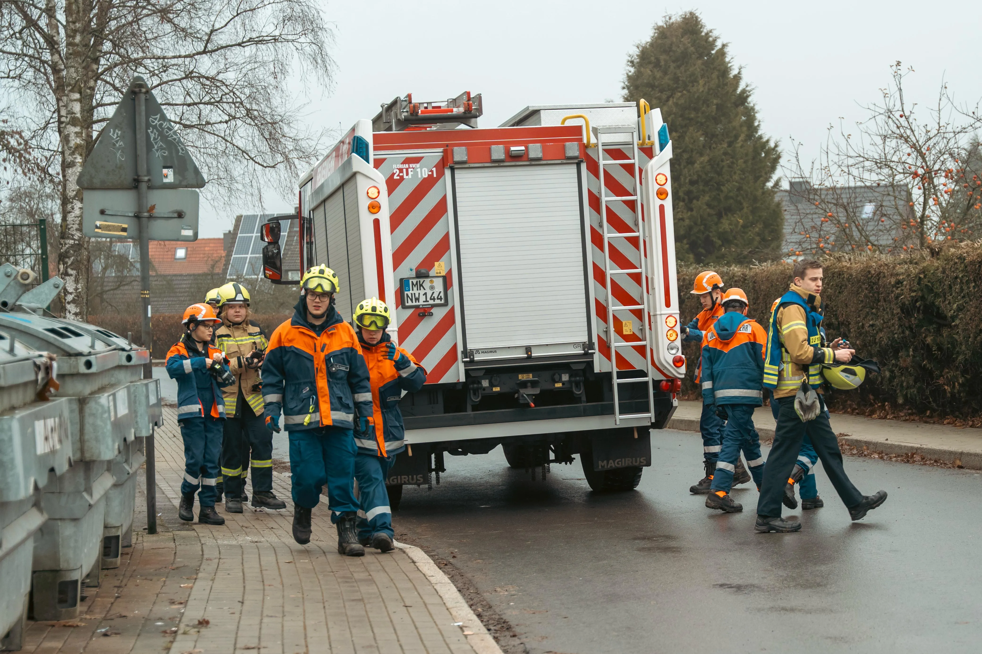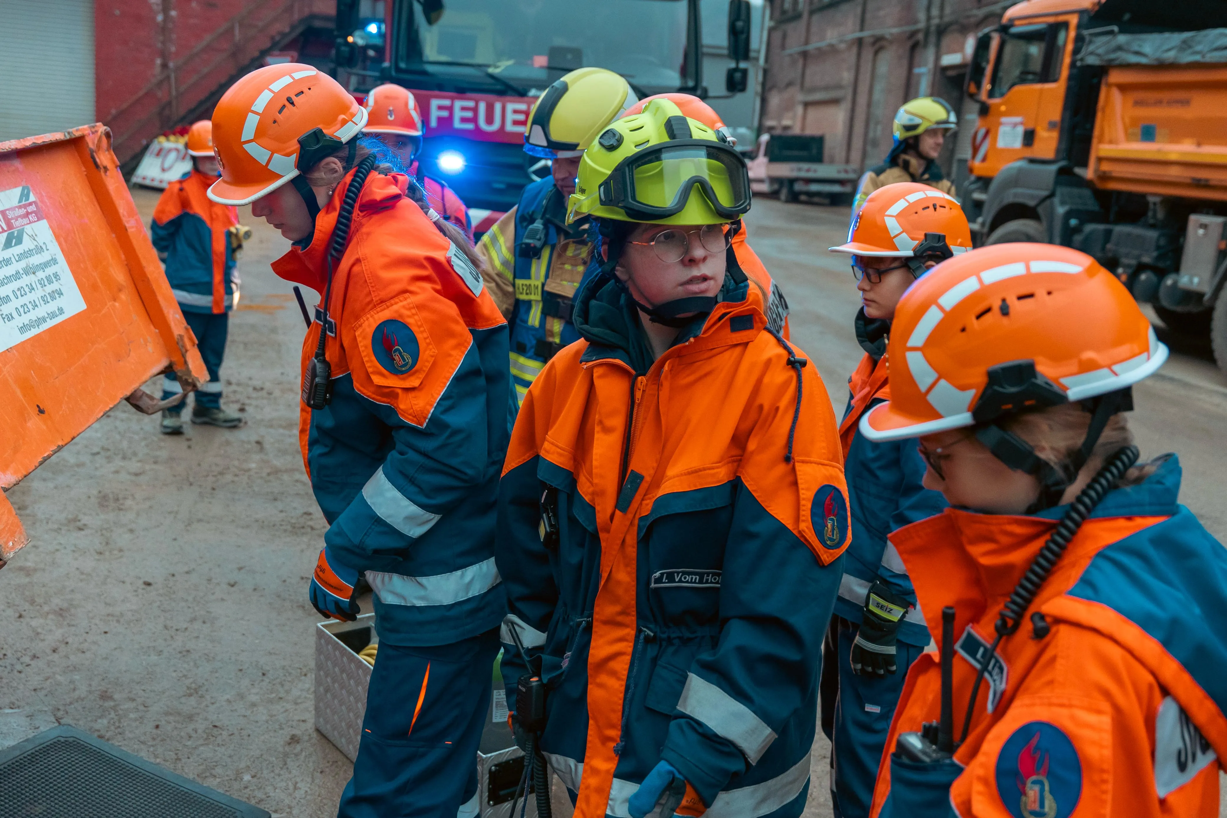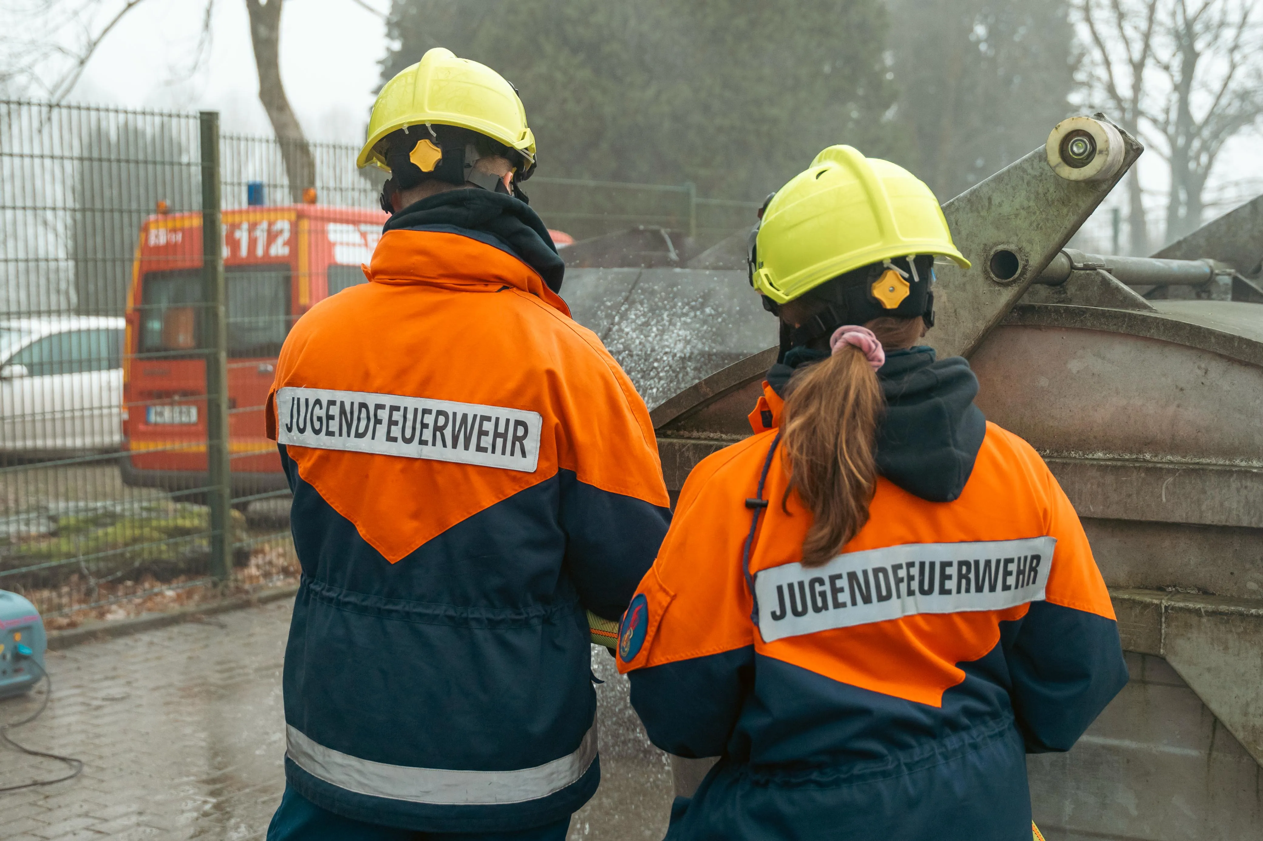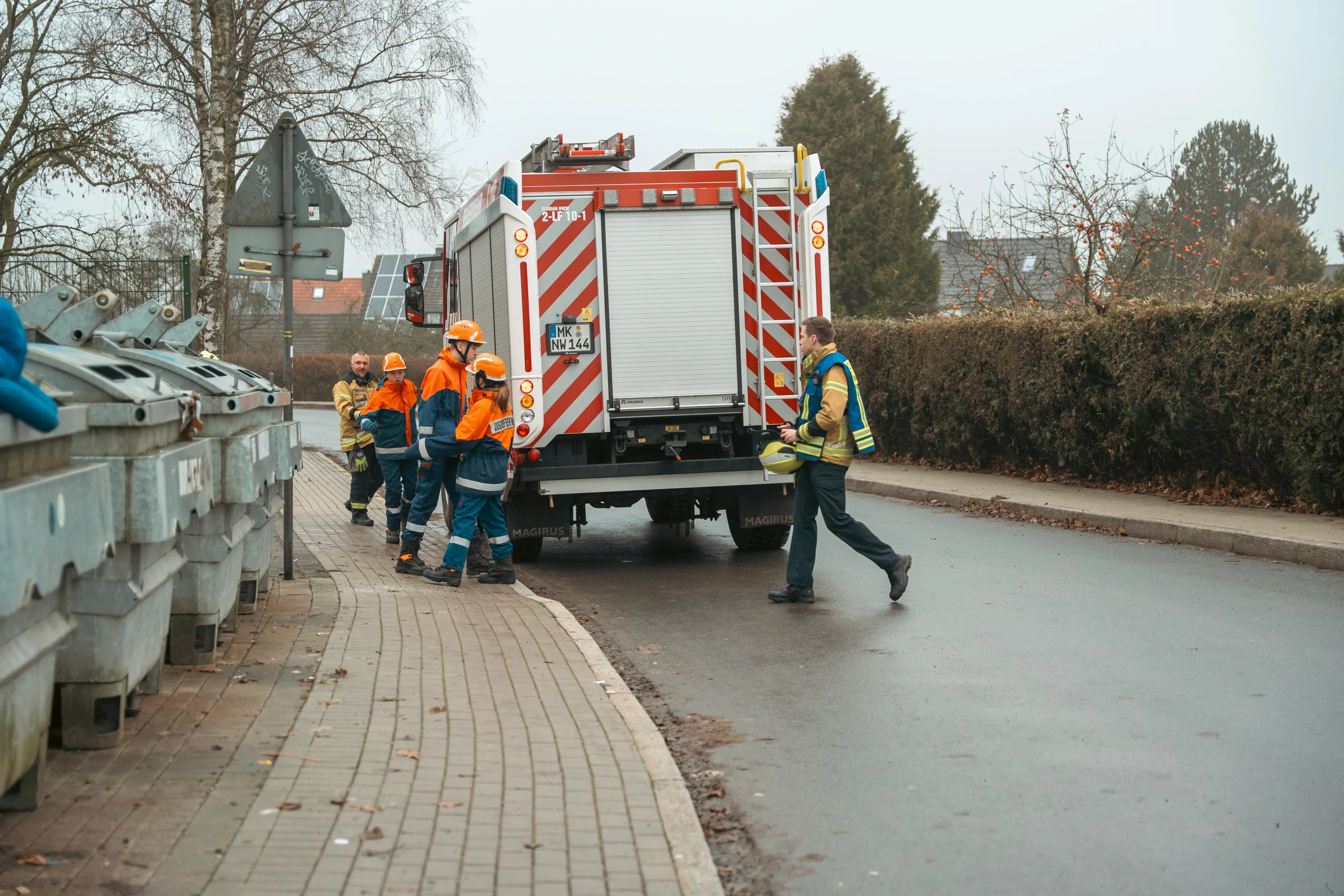 An der Heide brennt ein Papiercontainer. Am Nachmittag geht es weiter nach Nachrodt: Auf dem Gelände des Tiefbauers Homann ist technische Hilfe gefragt. Besonders: Diese beiden Übungen wurden von Mitgliedern der Jugendfeuerwehr selbst vorbereitet. Lea Lüno und Lukas Nowak haben die Szenarien gemeinsam mit ihren Eltern, beide ebenfalls Feuerwehrleute, ausgearbeitet. Verantwortung übernehmen, vorausdenken, Abläufe planen – auch das gehört hier zur Ausbildung.