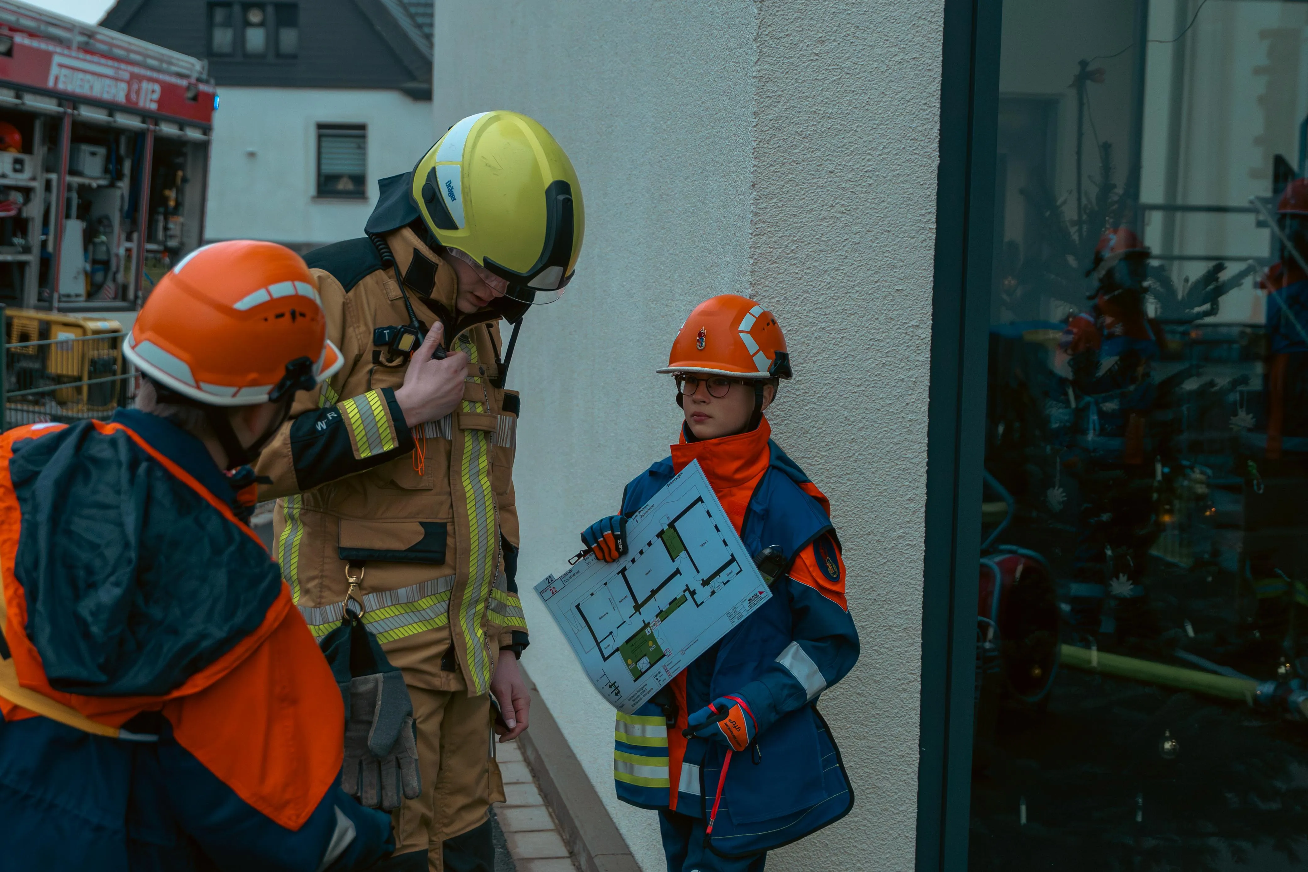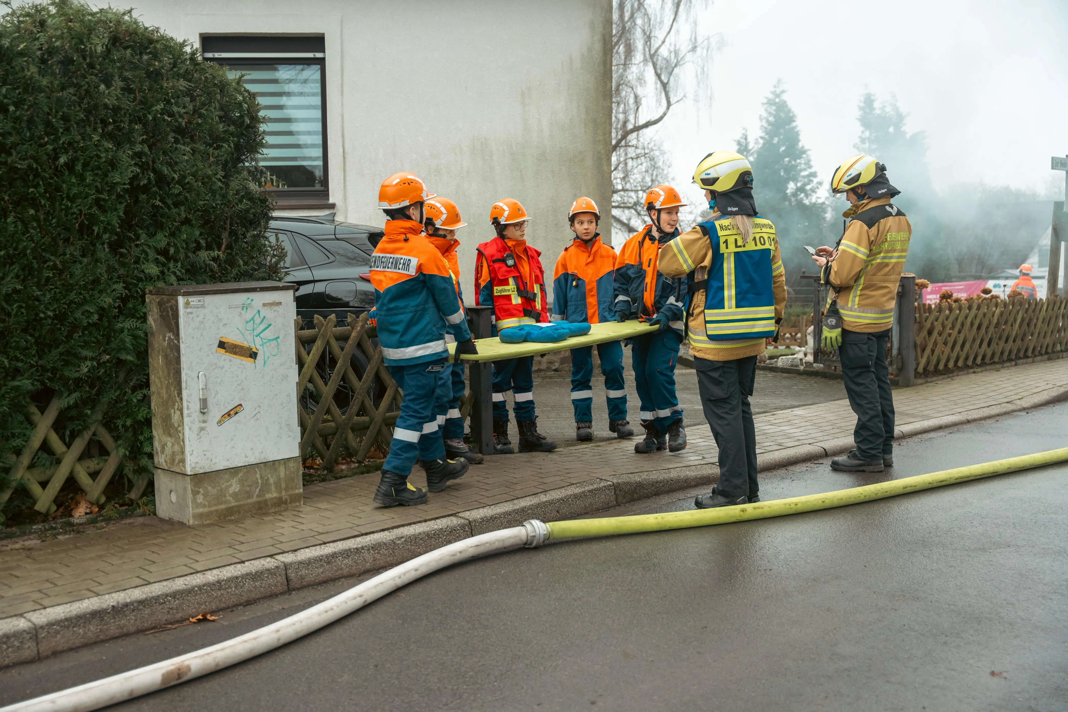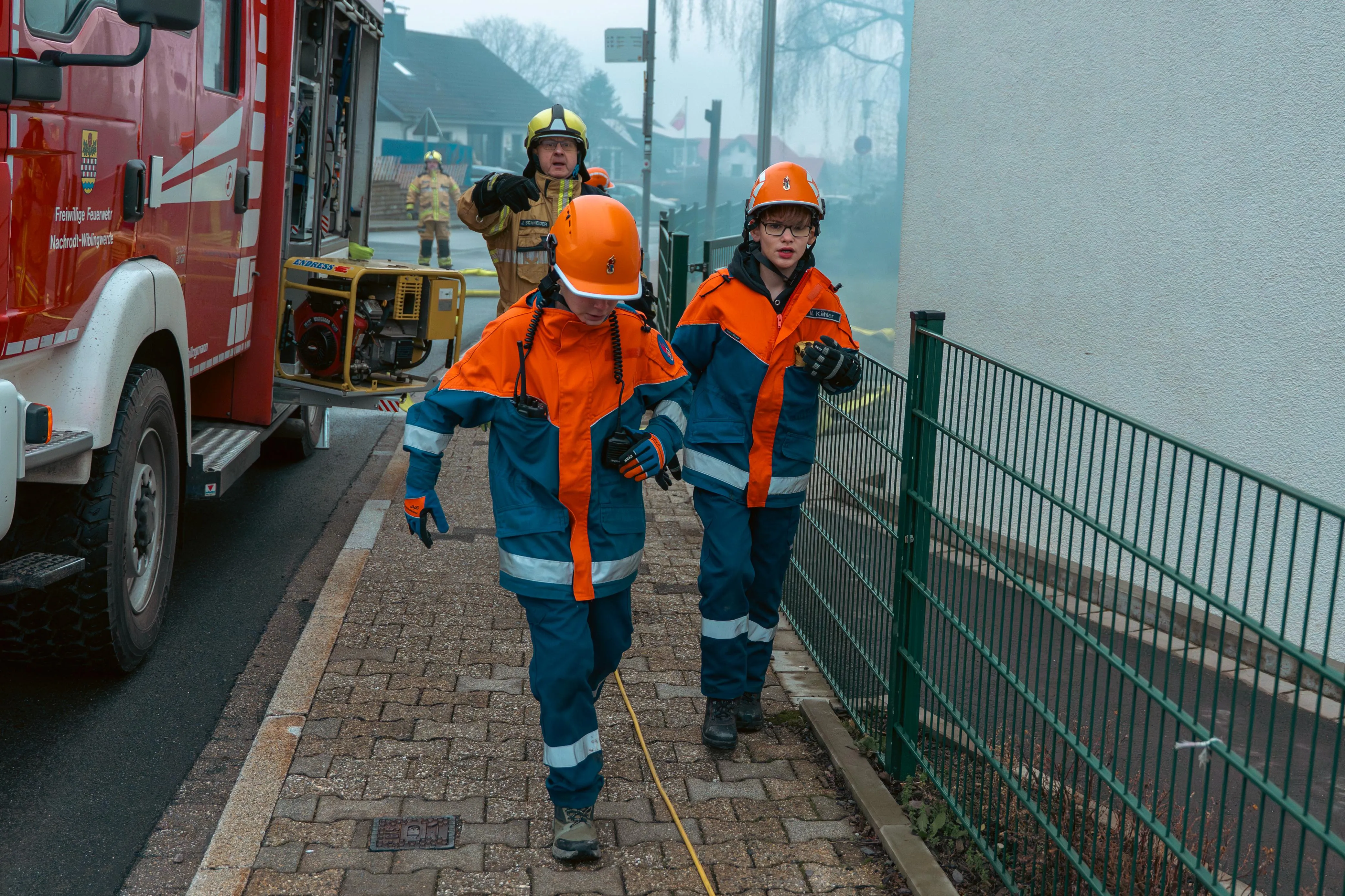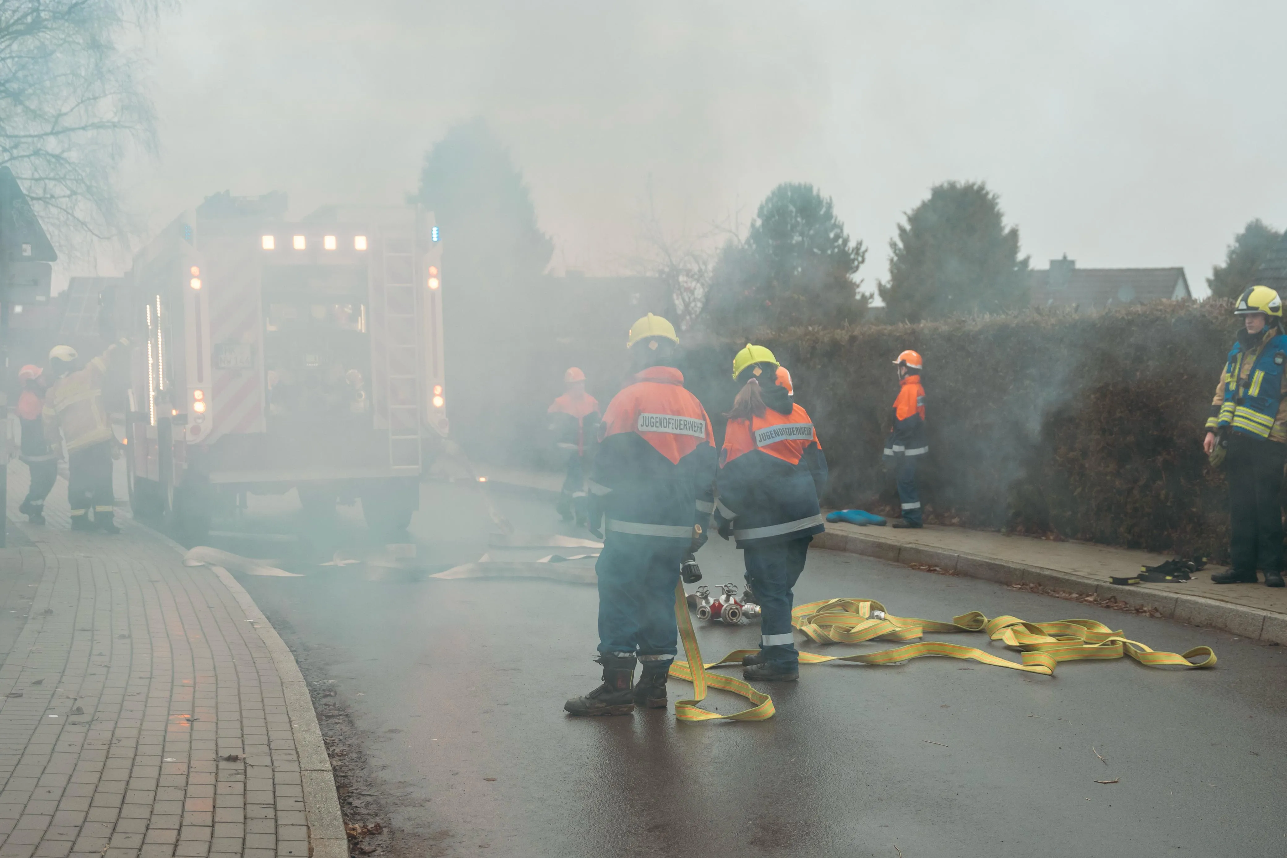 Sofort greifen die Abläufe. Zwei Löschangriffe werden aufgebaut, ein Trupp geht unter Atemschutz ins Gebäude zur Menschenrettung vor. Dichter Rauch nimmt nahezu jede Sicht. Die Jugendlichen werden – wie bei einem echten Einsatz – eingeteilt: Löschen, Suchen, Retten, Absichern. Einer kontrolliert die Brandmeldeanlage, ein anderer sichert die Einsatzstelle. Jeder Handgriff zählt.