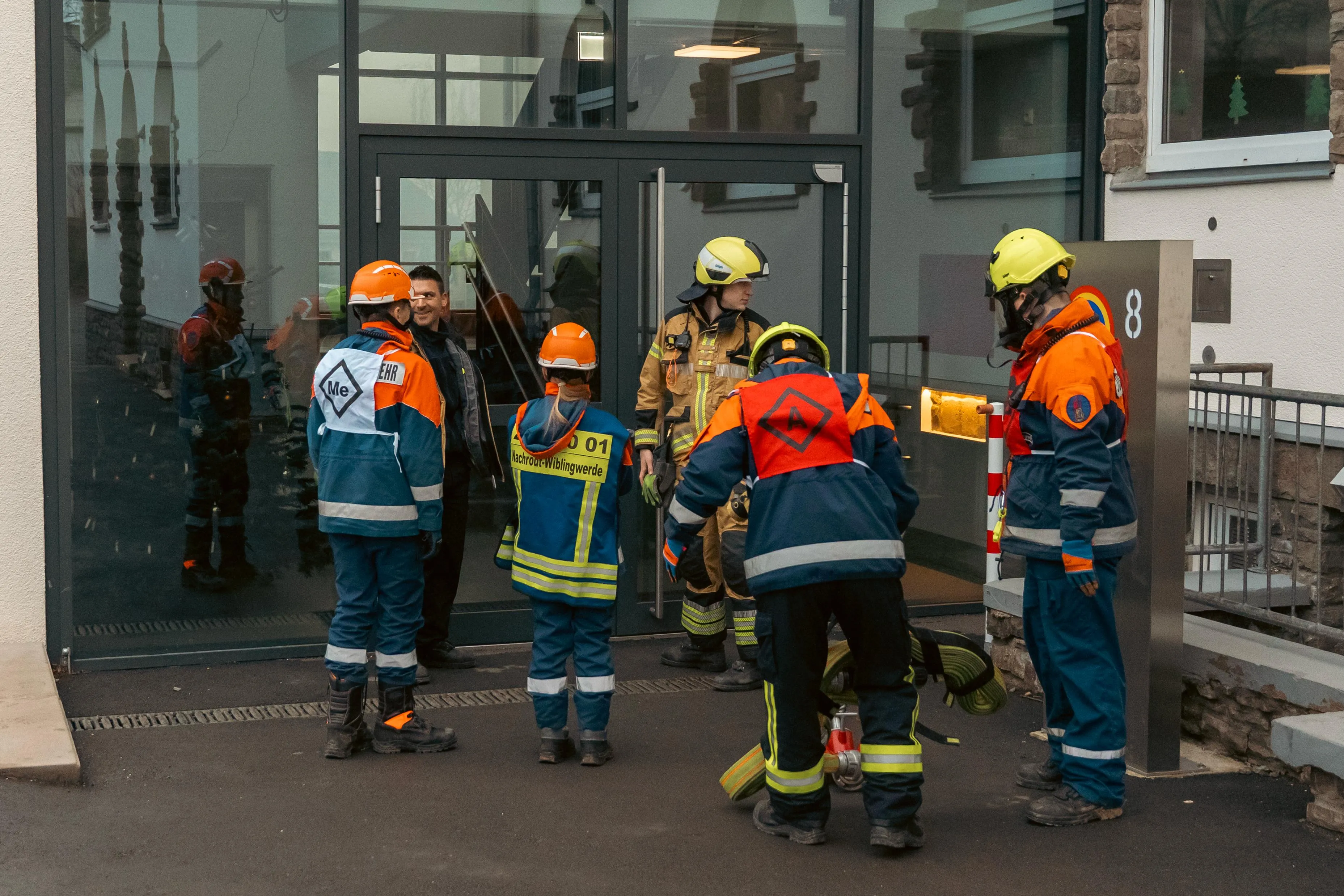 Der Sonntag bringt den Höhepunkt: die große Abschlussübung, ausgearbeitet von der Wehrleitung. Einsatzort ist die Grundschule Wiblingwerde. Das Szenario wirkt erschreckend real: Der Rauchmelder hat ausgelöst, zwei Papiercontainer hinter dem Gebäude stehen in Vollbrand, eine Fensterscheibe ist bereits zerborsten, das Schulgebäude stark verraucht. Zudem gilt ein Kind als vermisst.