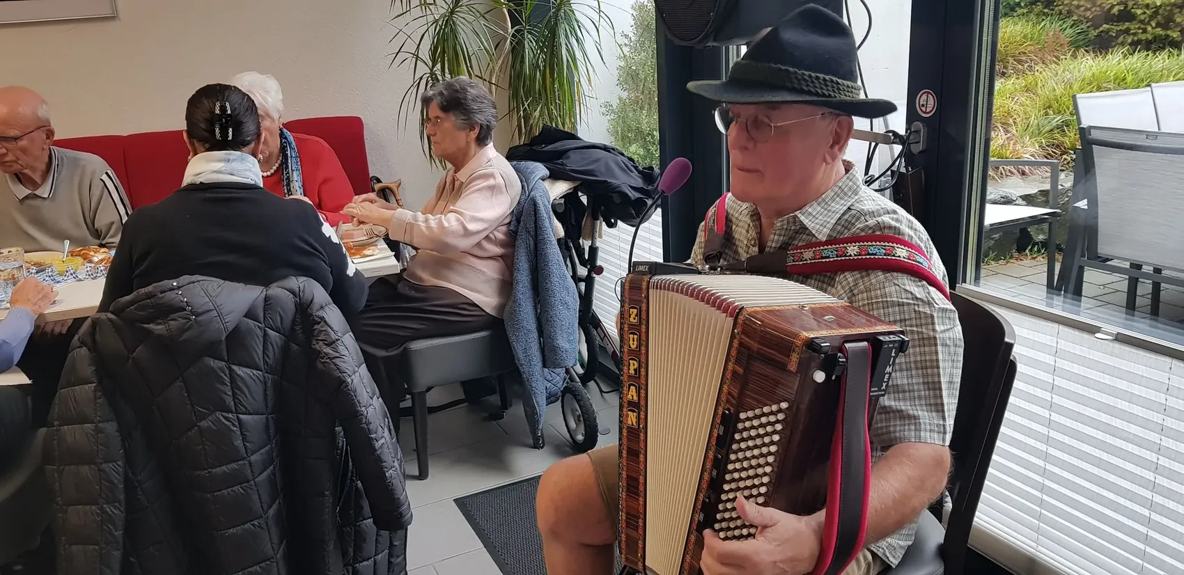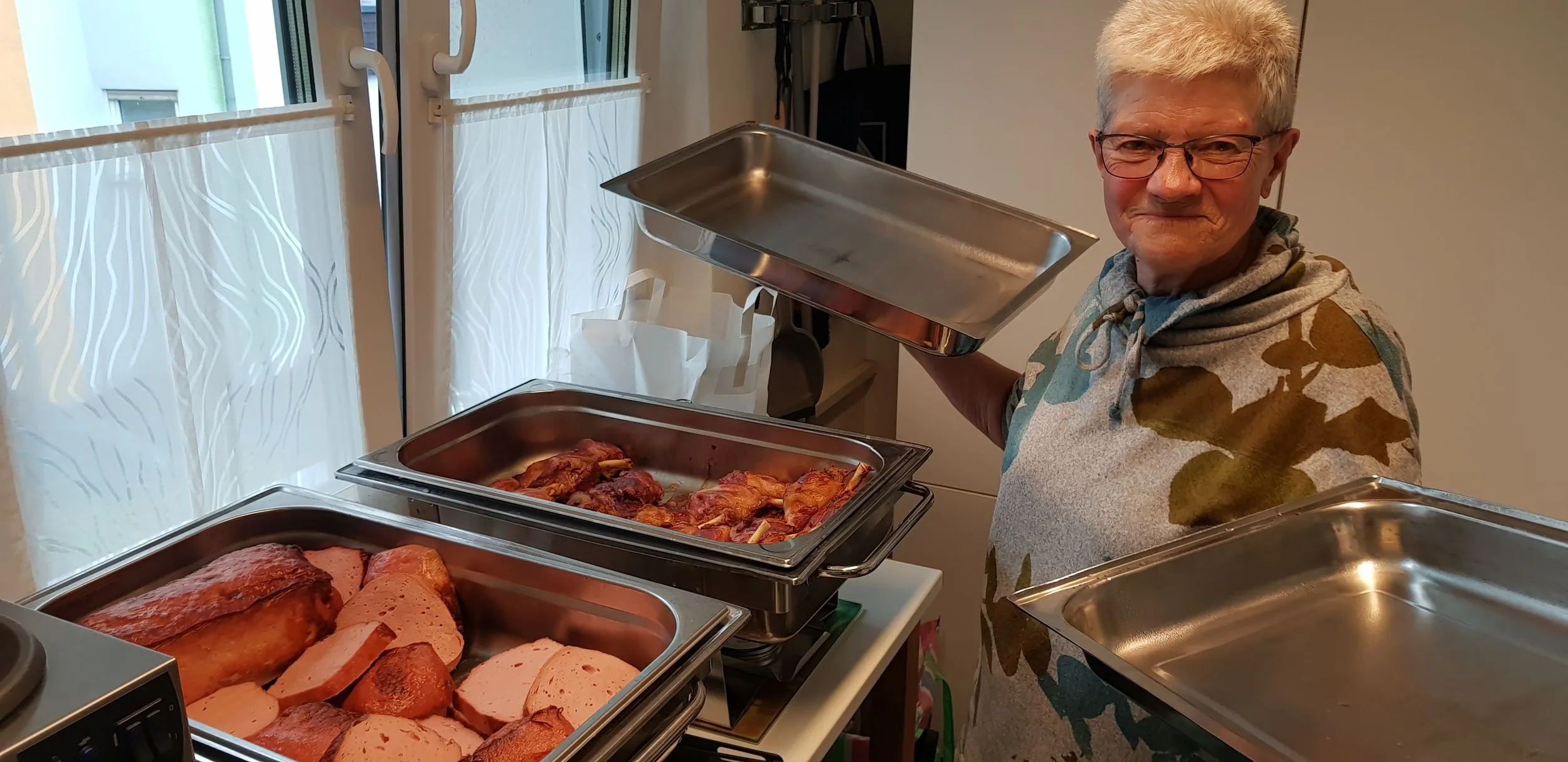 Jeweils dienstags gibt es in dem Sozialcafé einen Mittagstisch. Wer d’Wiesn in München verpasst hatte, konnte am Prumbomweg noch ein bisschen nachfeiern. Wilfried Schmidt sorgte mit seinem Akkordeon für den musikalischen Rahmen. Das Café-Team hatte Wände und Tische bayerisch dekoriert. Natürlich passte da auch der Mittagstisch zum Fest. Serviert wurden wahlweise Haxen oder Leberkäse mit Sauerkraut und Laugenbrezel, die ein Caterer geliefert hatte.