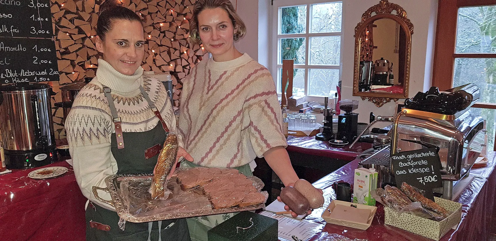 Wildwürstchen vom Grill, wärmende Feuerschale im Hof, Weihnachtsbäume in allen Größen, Waffeln, Schnittchen mit Hausmacher Wurst, die man durchprobiert. Spezialitäten, die man nicht alle Tage bekommt. Für einen Besucher aus Meinerzhagen genau die richtigen Weihnachtsgeschenke für die Geschwister: Gaumenschmaus.