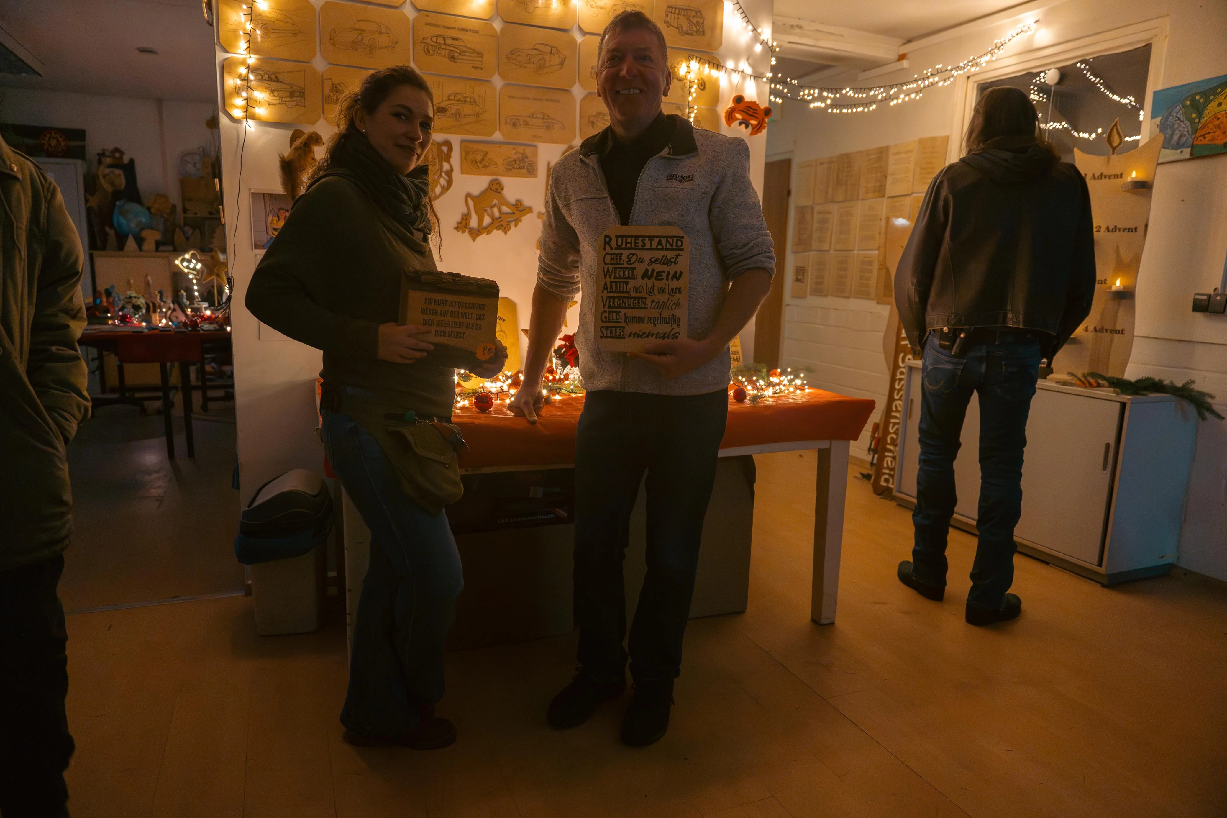 Die Werke, die zum Verkauf standen, waren mehr als nur Gebrauchsgegenstände: kleine Holzlaternen, kunstvoll verzierte Werkstücke — manche schlicht und robust, andere filigran und fein gearbeitet. Besonders beliebt waren die großen, massiven Laternen. Sie waren innerhalb kürzester Zeit ausverkauft. „Eigentlich wollten wir morgen noch welche mit auf den Weihnachtsmarkt nach Nachrodt nehmen. Aber was weg ist, ist weg“, freut sich Triches. Denn jeder Verkauf, bedeutet auch Einnahmen für die Freizeitkasse der Bewohner. Daraus werden besondere Ausflüge oder Aktionen finanziert.