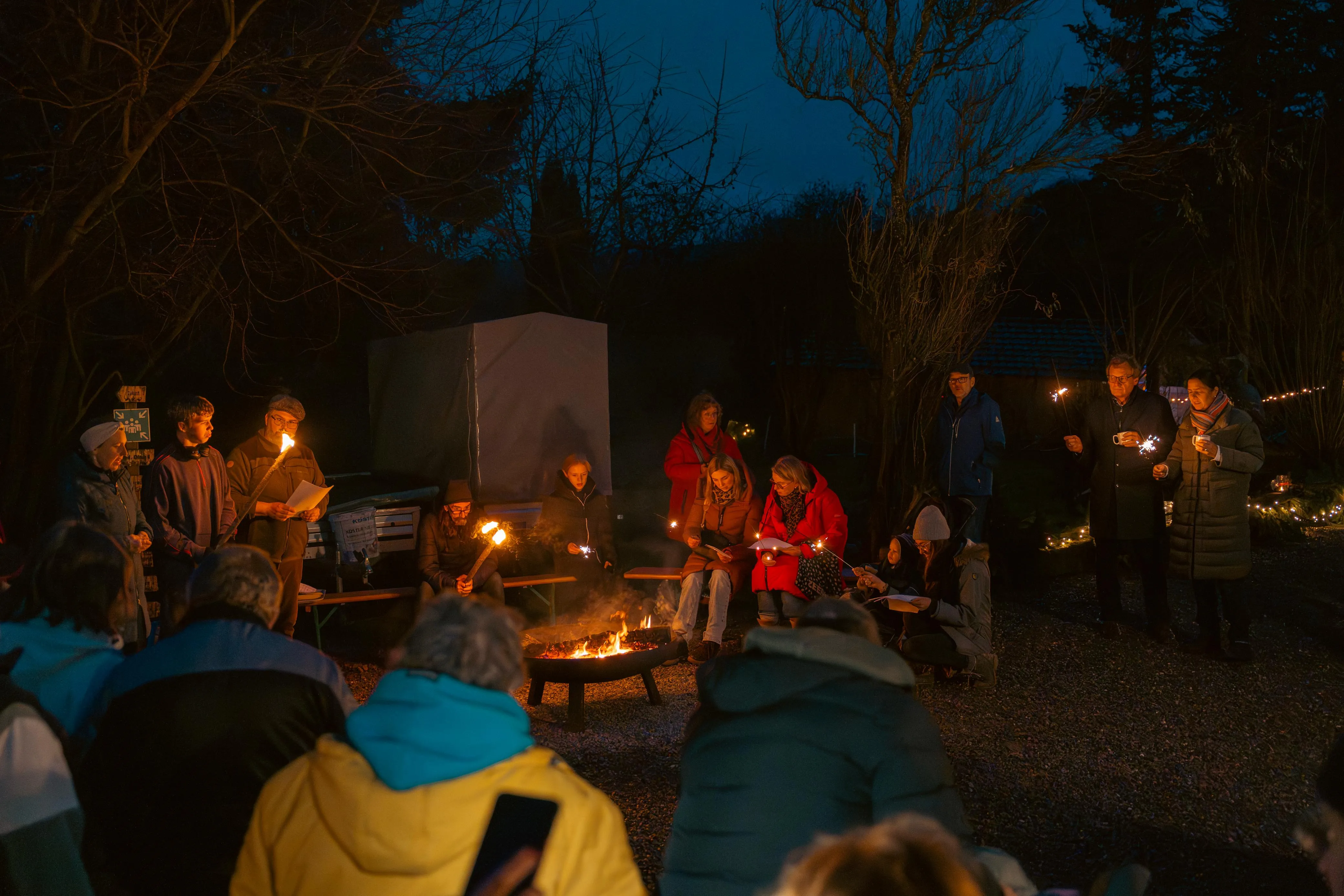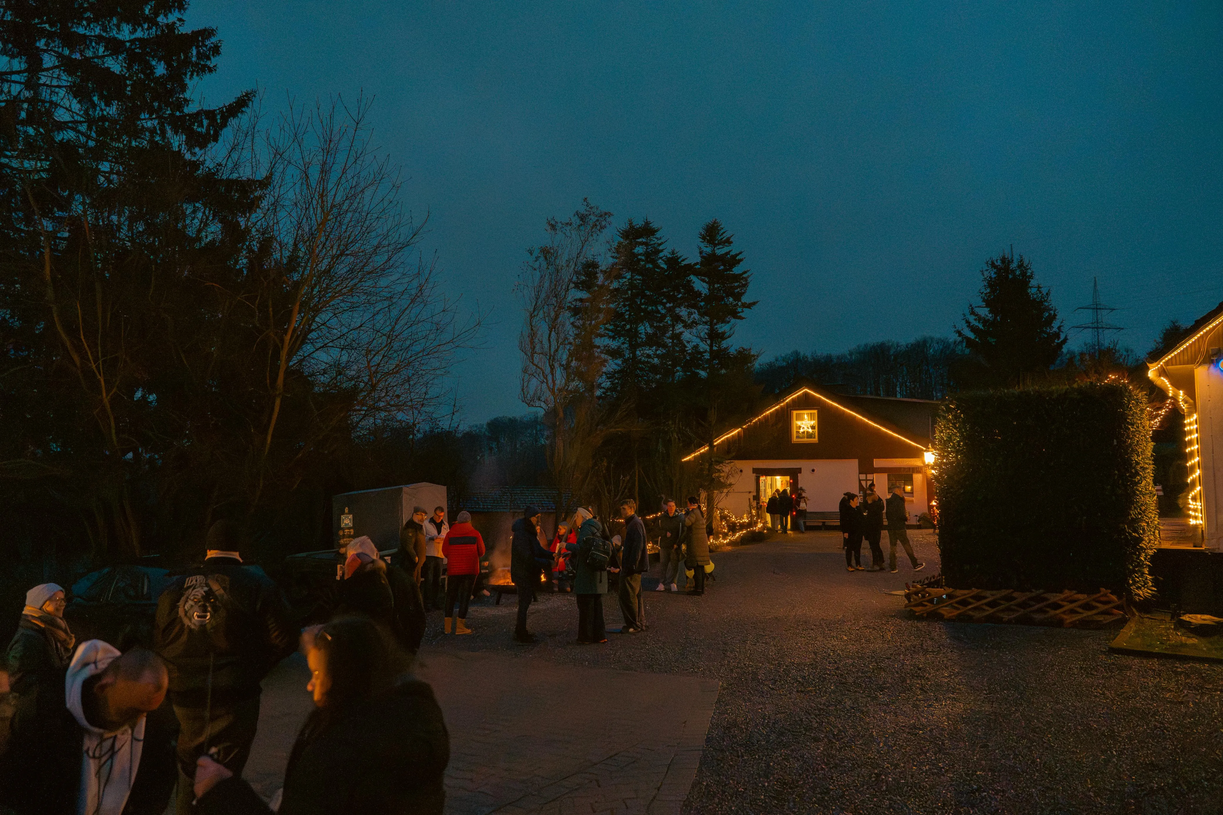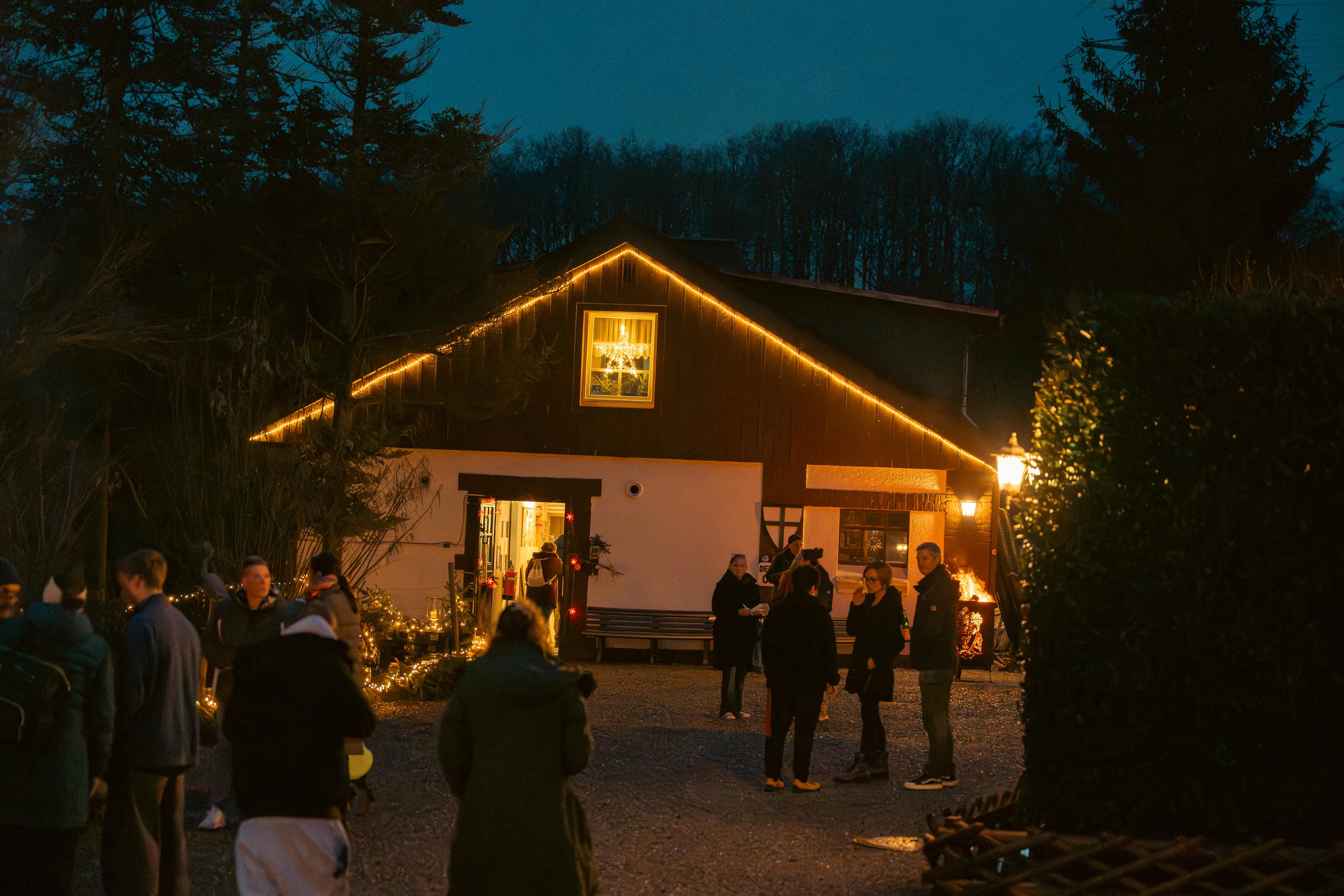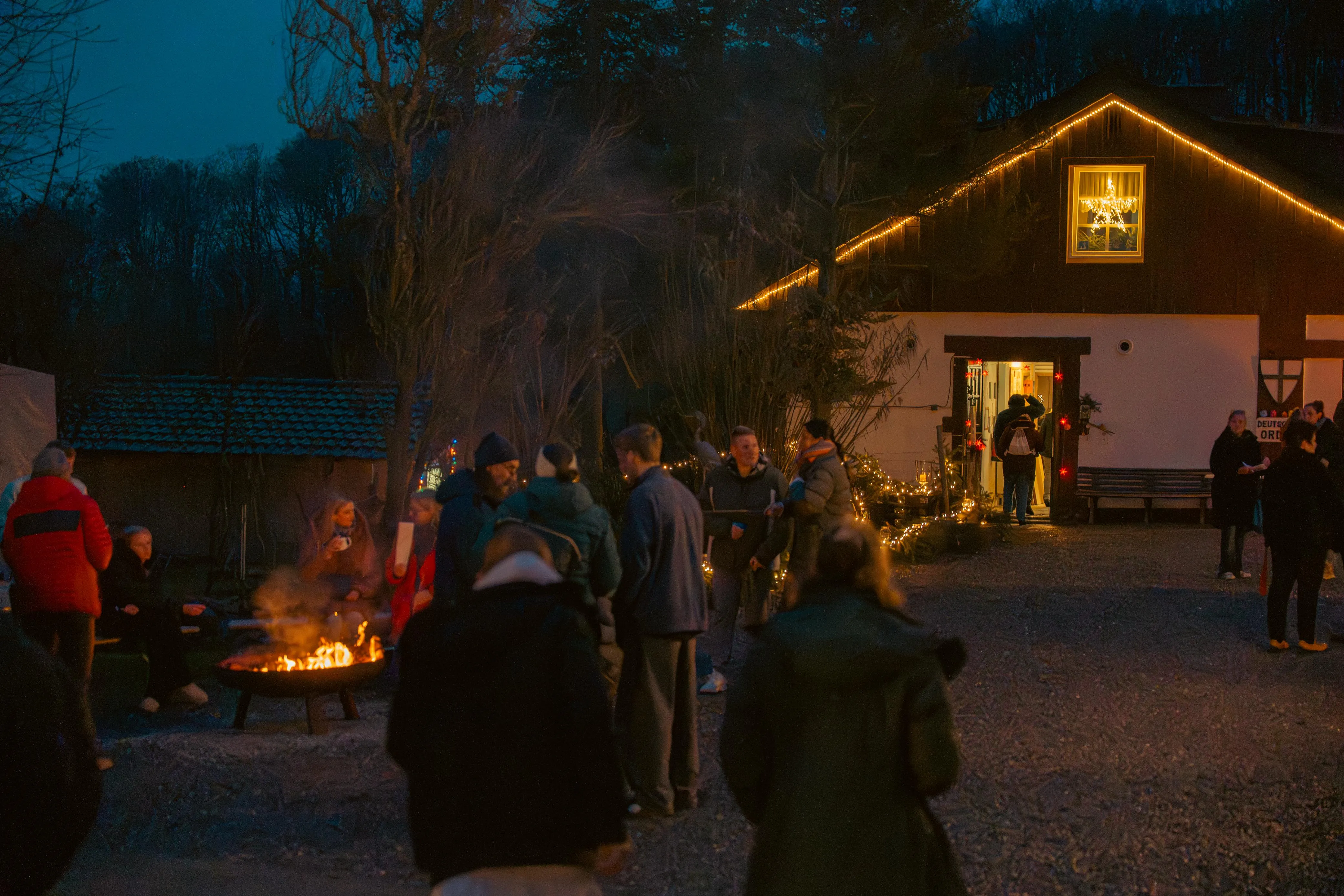 Als die Besucher den Hof betraten, leuchteten riesige Laternen am Eingang — ein erster Hauch von winterlichem Zauber. Ein Duft von frisch gebackenen Waffeln, Bratwurst und heißem Kakao zog durch die Luft, mischte sich mit dem Knacken der Feuertonnen und ließ sofort eine warme, einladende Stimmung entstehen. Bewohner, Mitarbeitende, Angehörige und zahlreiche Gäste flanierten über das Gelände, plauderten, staunten — und fanden sich bald in lebhaften Gesprächen wieder.