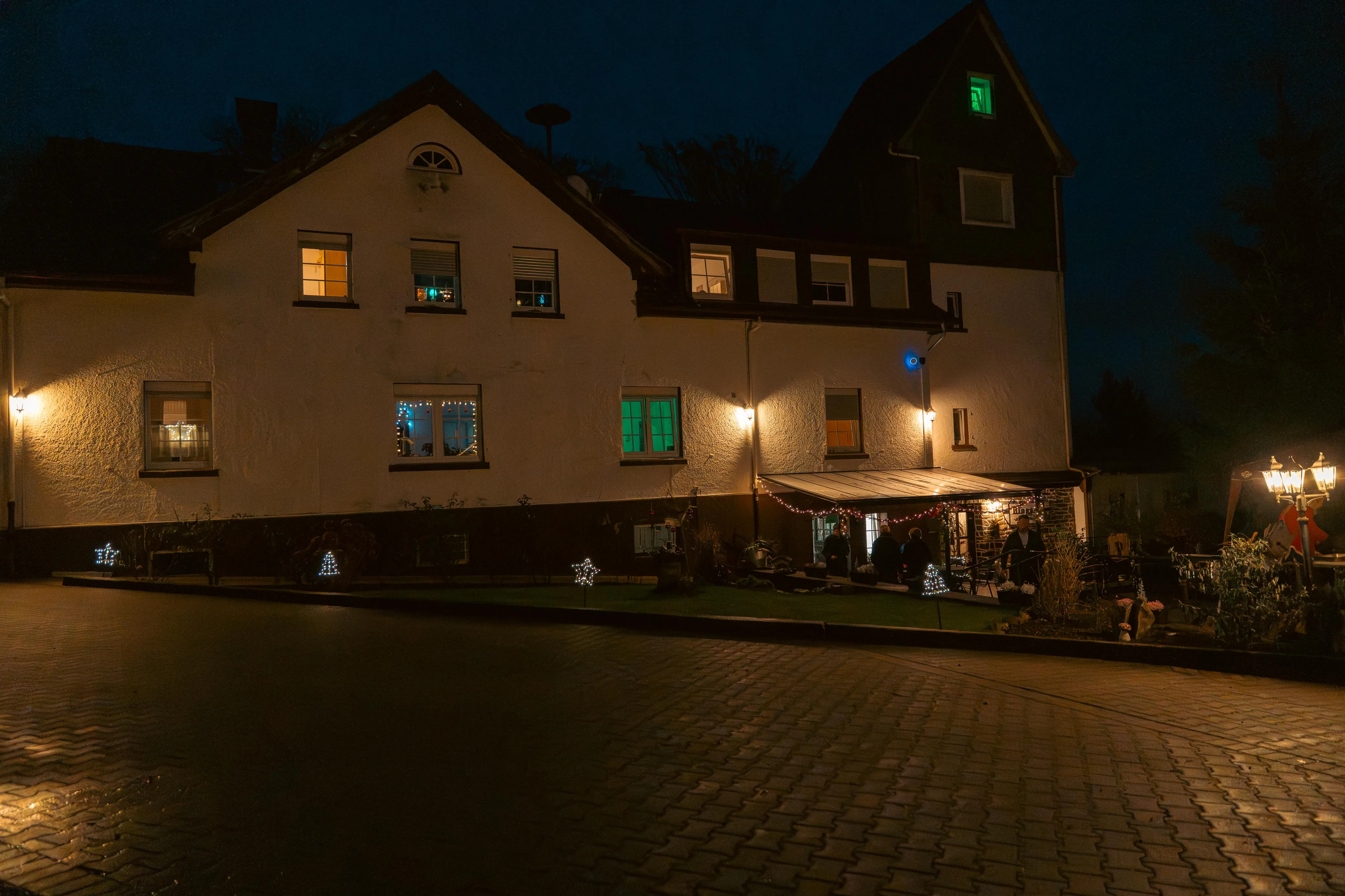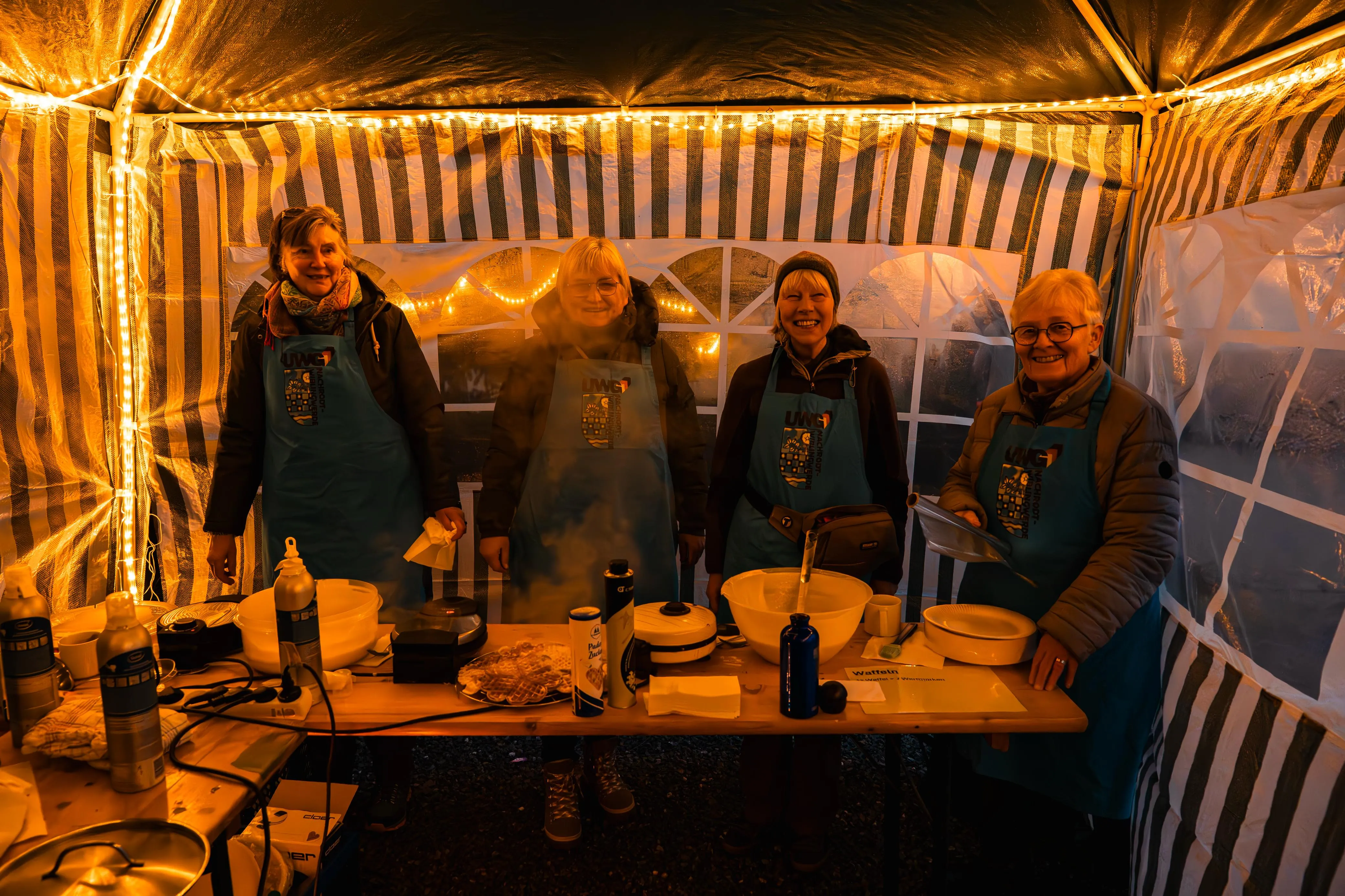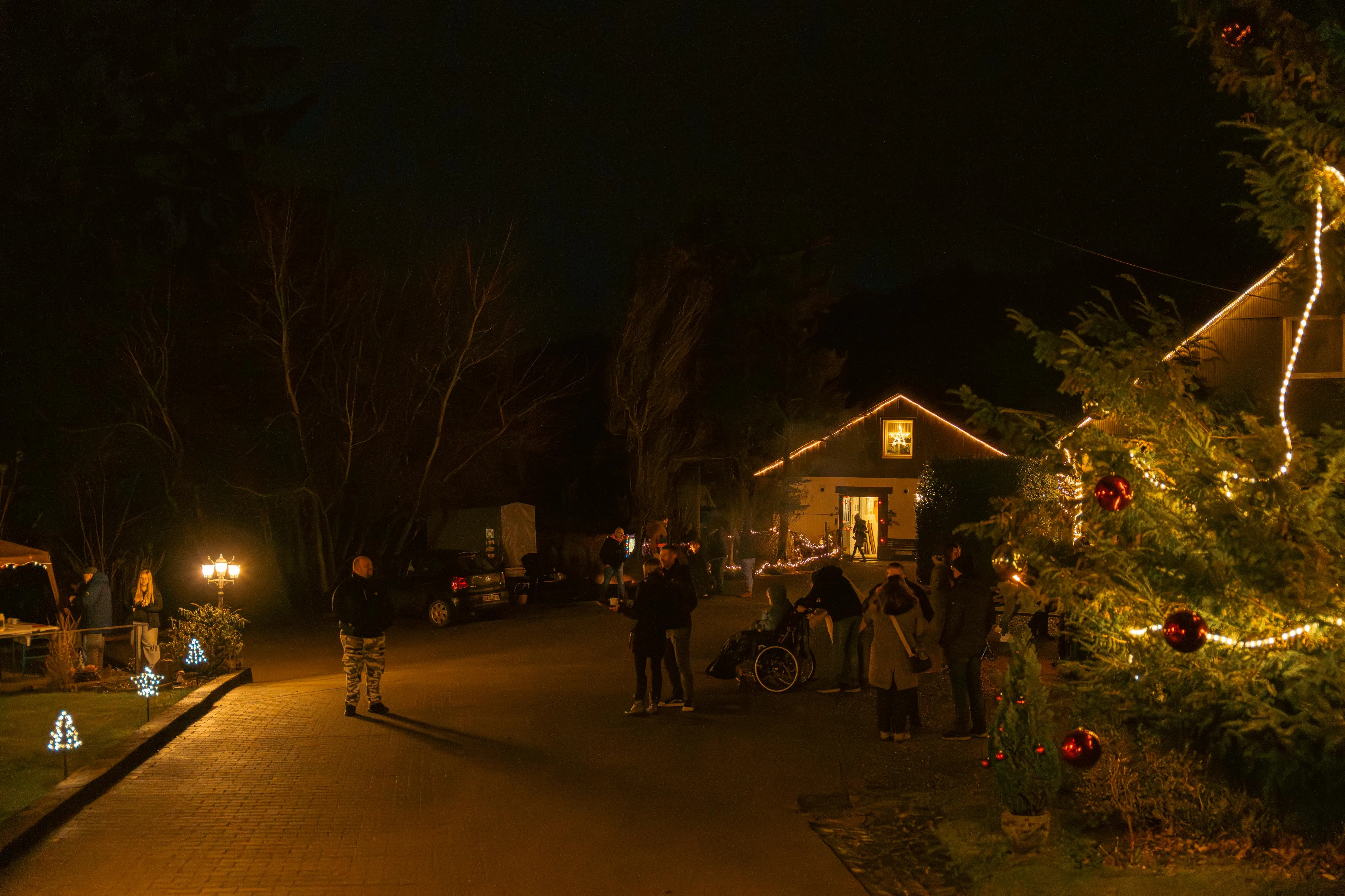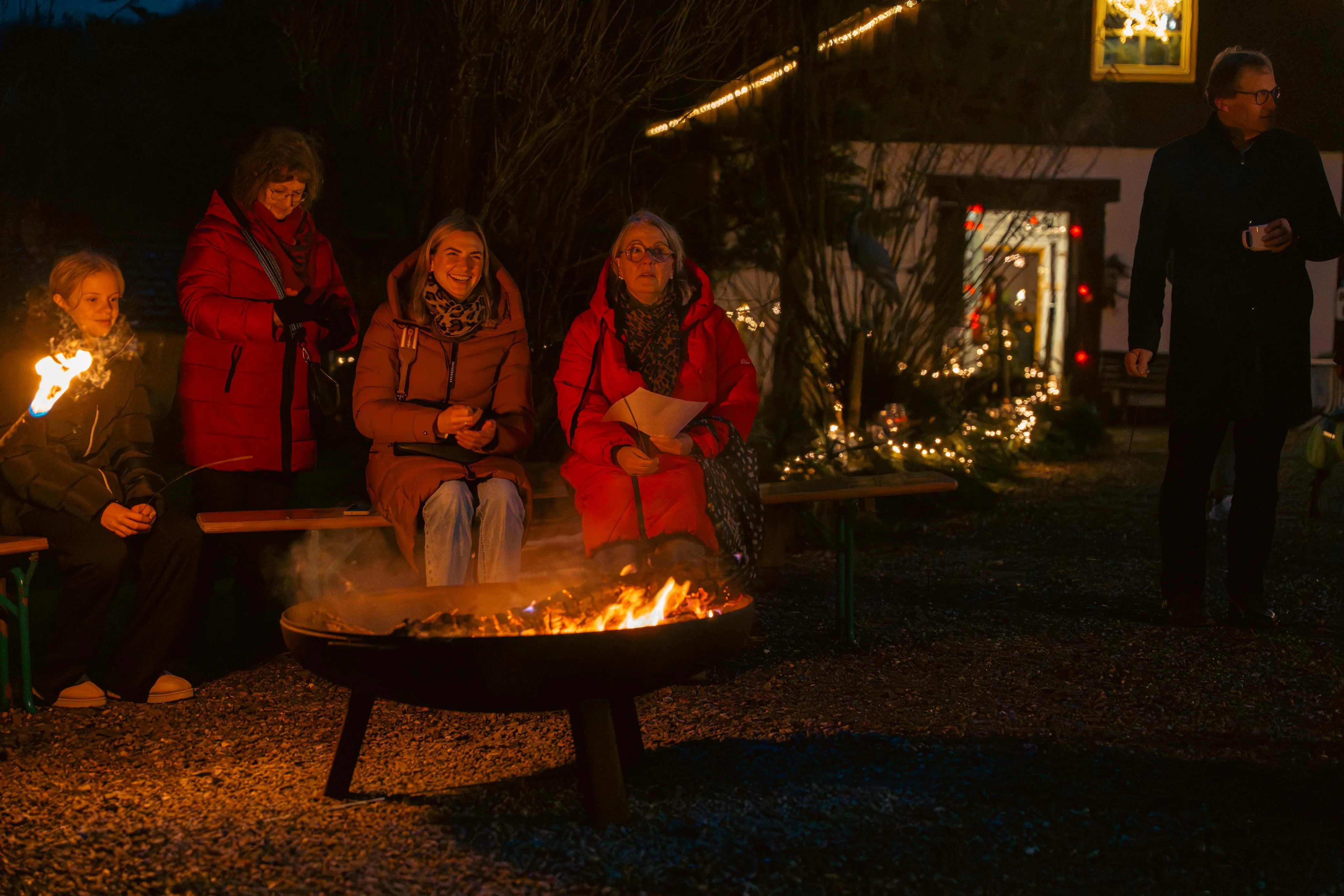 Als die Besucher den Hof betraten, leuchteten riesige Laternen am Eingang — ein erster Hauch von winterlichem Zauber. Ein Duft von frisch gebackenen Waffeln, Bratwurst und heißem Kakao zog durch die Luft, mischte sich mit dem Knacken der Feuertonnen und ließ sofort eine warme, einladende Stimmung entstehen. Bewohner, Mitarbeitende, Angehörige und zahlreiche Gäste flanierten über das Gelände, plauderten, staunten — und fanden sich bald in lebhaften Gesprächen wieder.