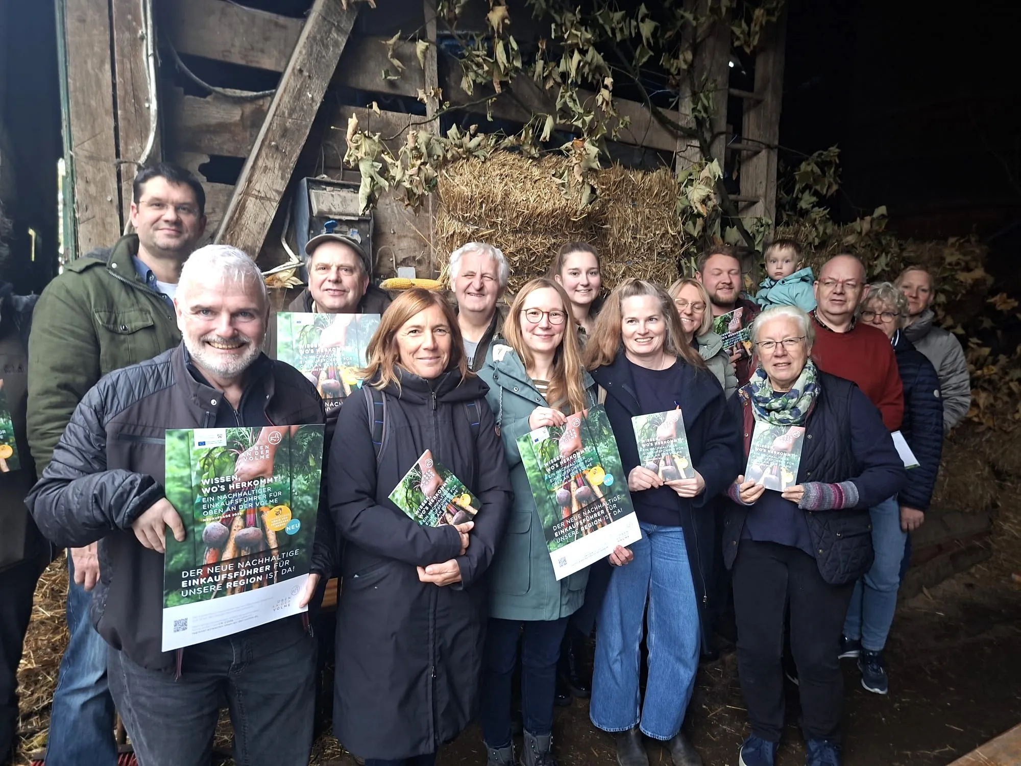 Vertreter der fünf Volme-Kommunen, des Regionalmanagements Oben-an-der-Volme, einige der in der Broschüre aufgeführten Direktvermarkter und Betreiber von Weltläden kamen auf dem Bio-Hof Wolf zusammen, um die Broschüre vorzustellen.
