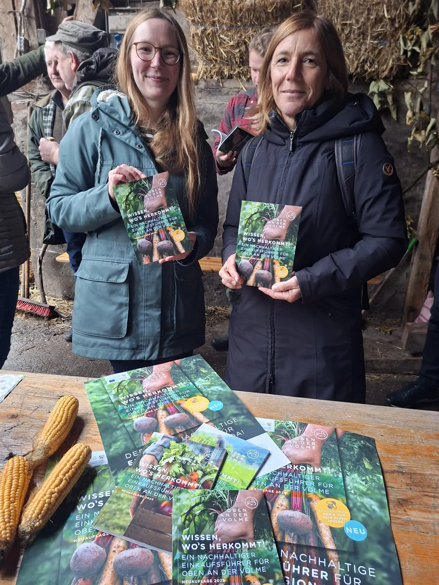 Gute Produkte kaufen, regional angebaut oder aus Tierhaltung, die für Hühner, Schweine oder Kühe nicht eine lebenslange Qual bedeuten: Wer das möchte, findet im neuen Einkaufsführer, "Wissen, wo's herkommt", viele Adressen und Kontaktdaten. Friederike Bönnen und Susanne Neumann vom Regionalmanagement "Oben an der Volme" stellten die dritte Auflage, die nach 2020 und 2023 von der Agentur Neuland aus Lindlar umgesetzt wurde, am Dienstag, 28. Oktober, auf dem Biohof Wolf in Oberbrügge vor.