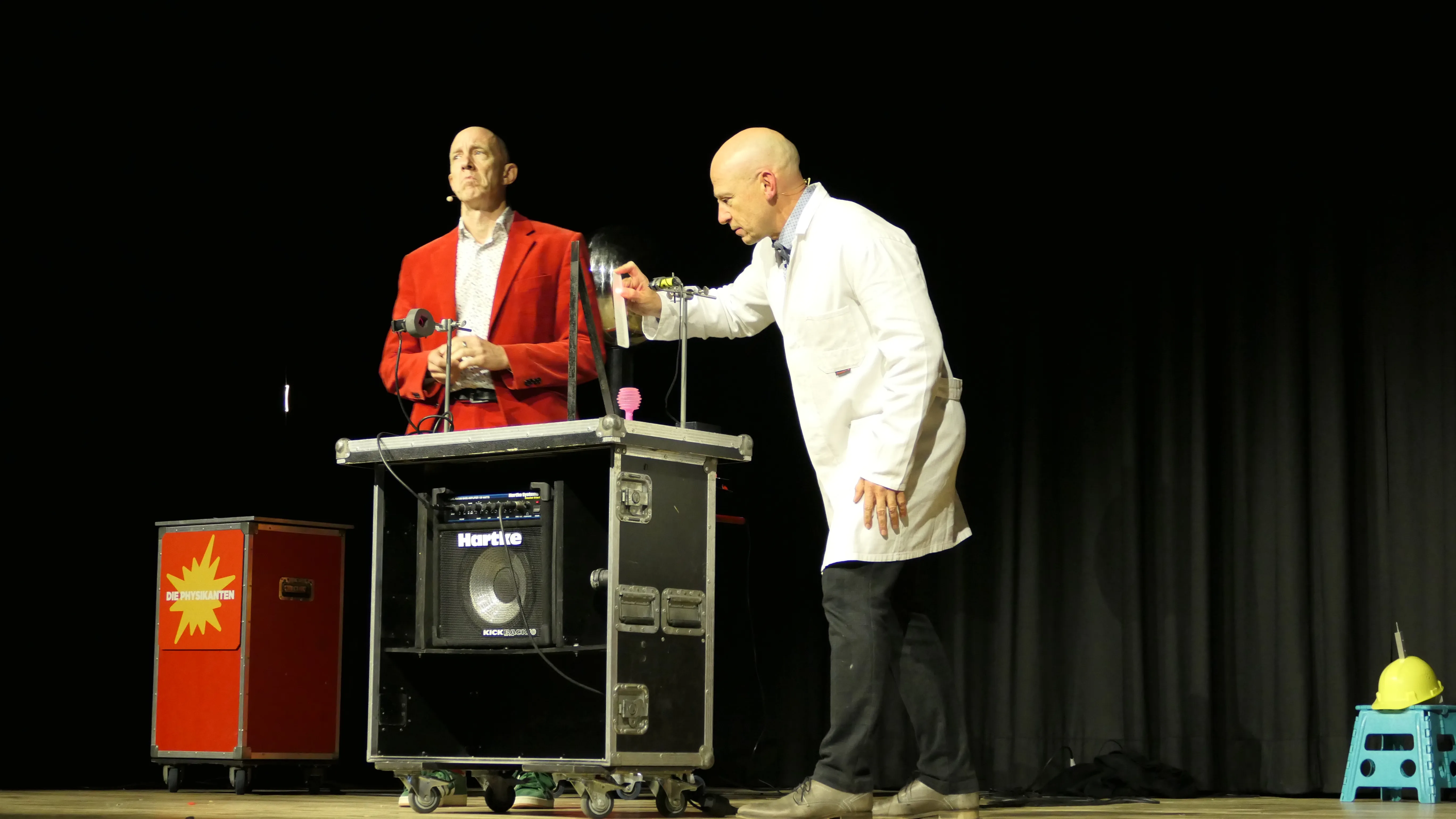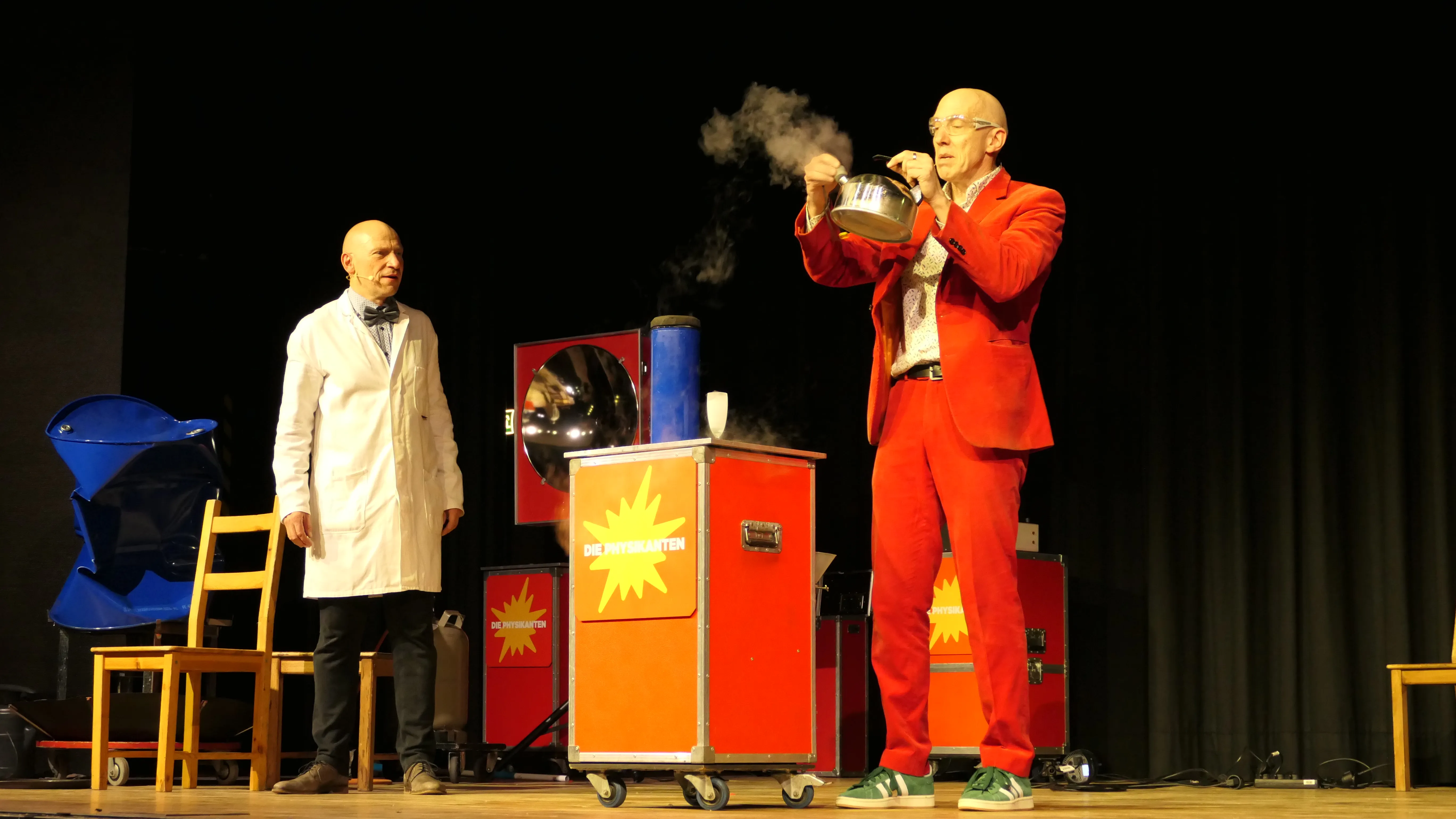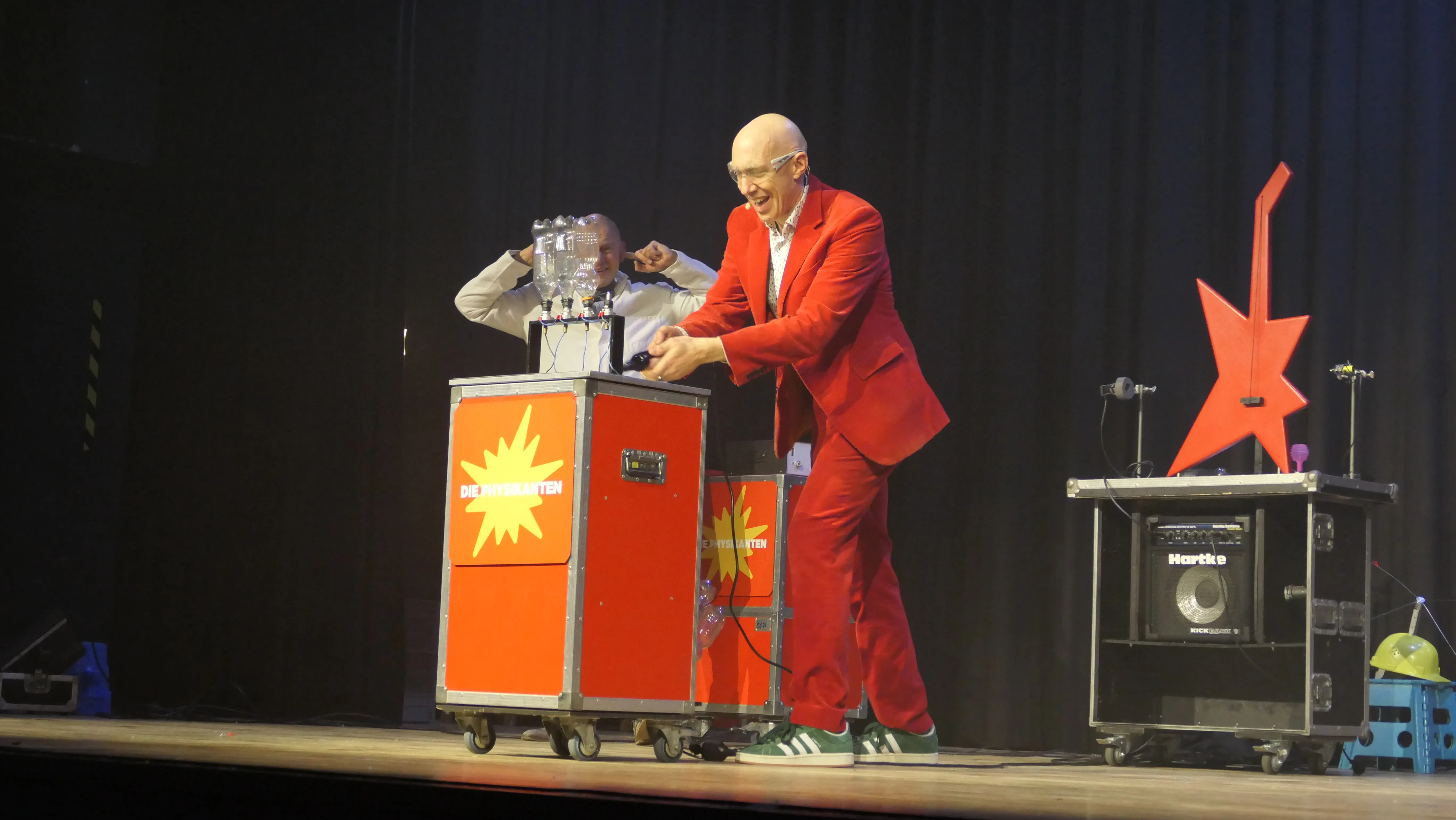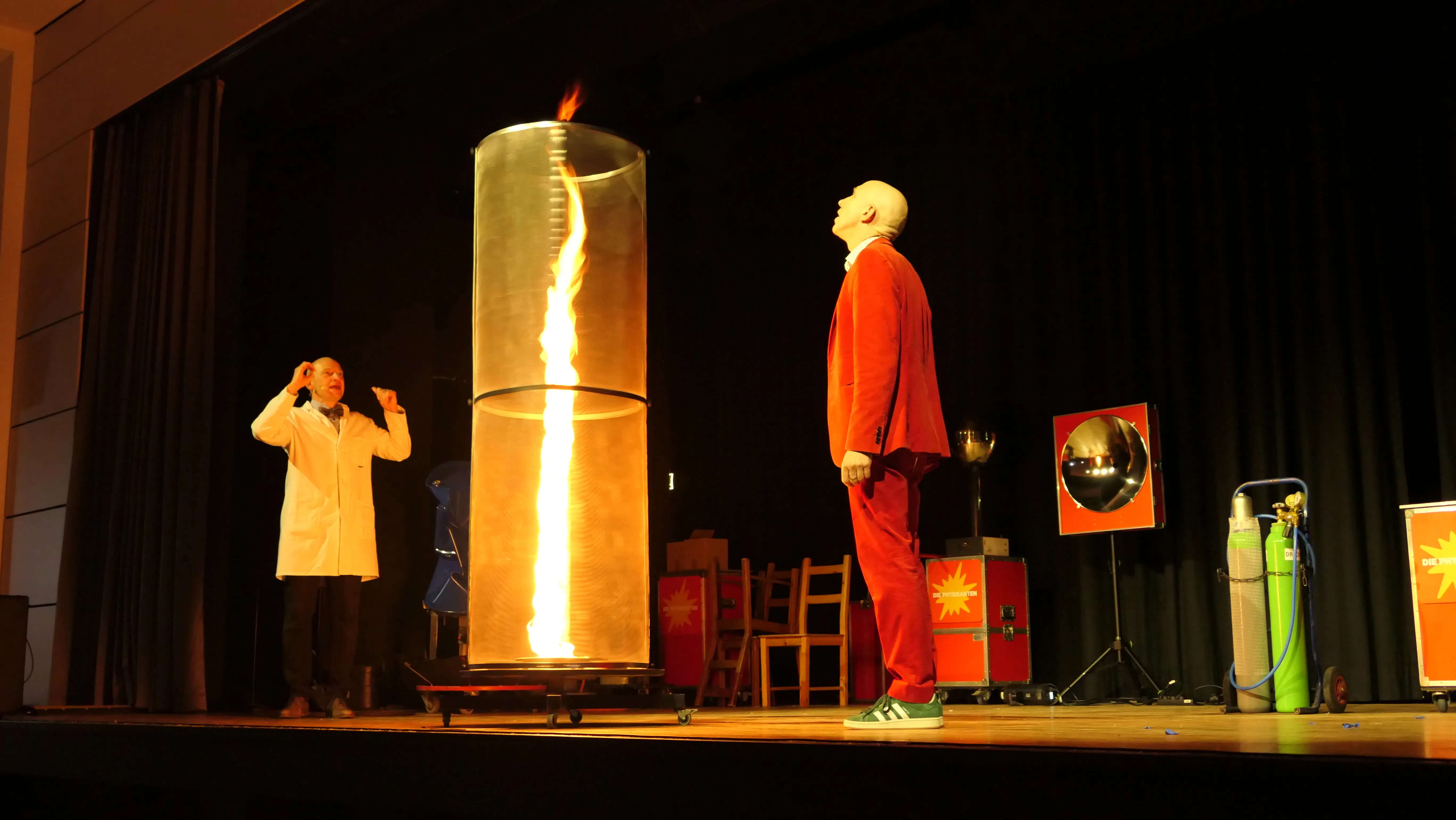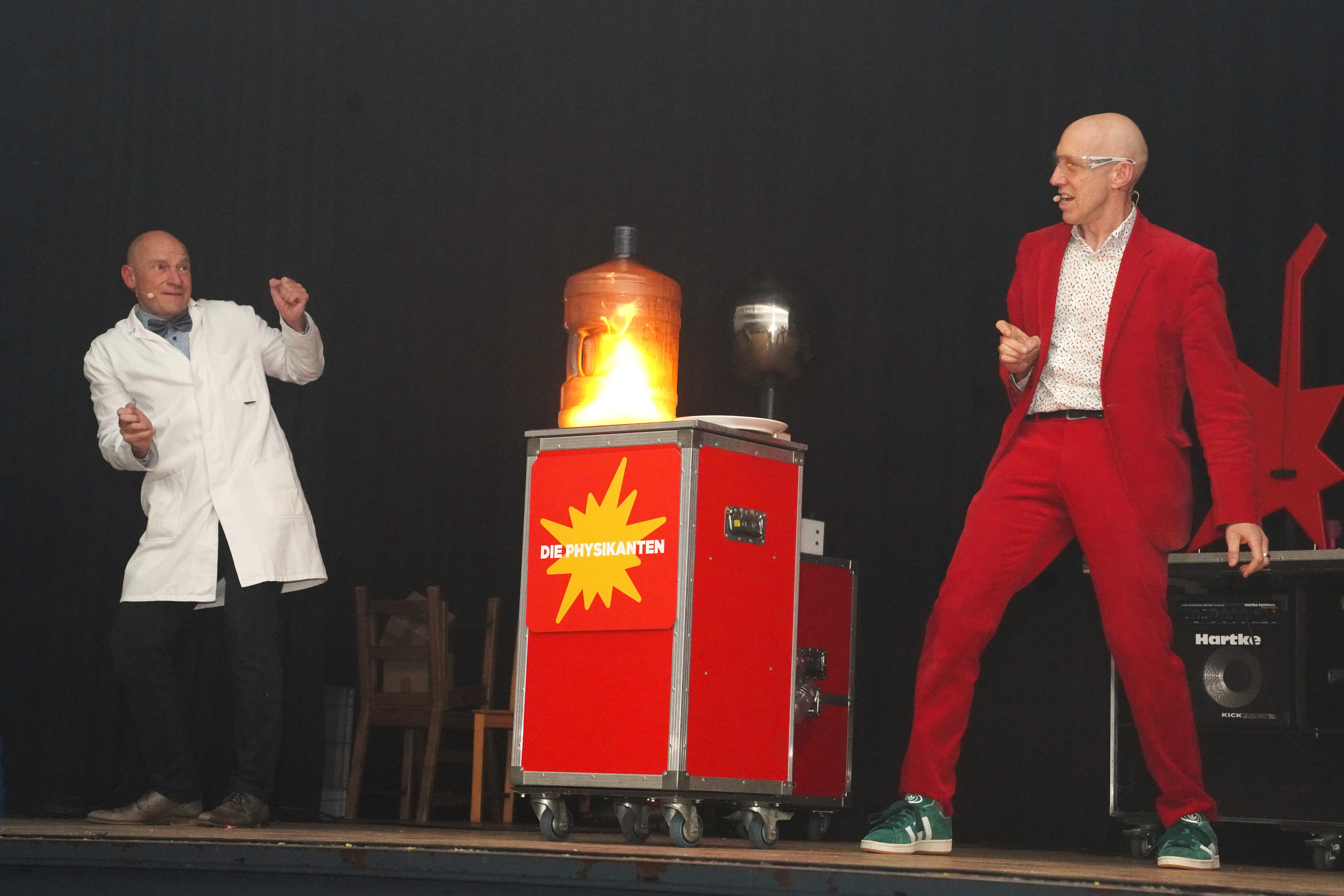 Der Diplom-Physiker Marcus Weber alias Herr Markus und der Schauspieler Hartmut Lehnert alias Professor Dr. Liebermann zogen alle Register der Physik, um diese anschaulich auf der Bühne zu präsentieren. „Learning by burning“ lautete die Begrüßung der zwei Akteure. Es bedeutet auf Deutsch wörtlich „Lernen durch Verbrennen“ Aber so weit kam es an diesem Abend nicht.