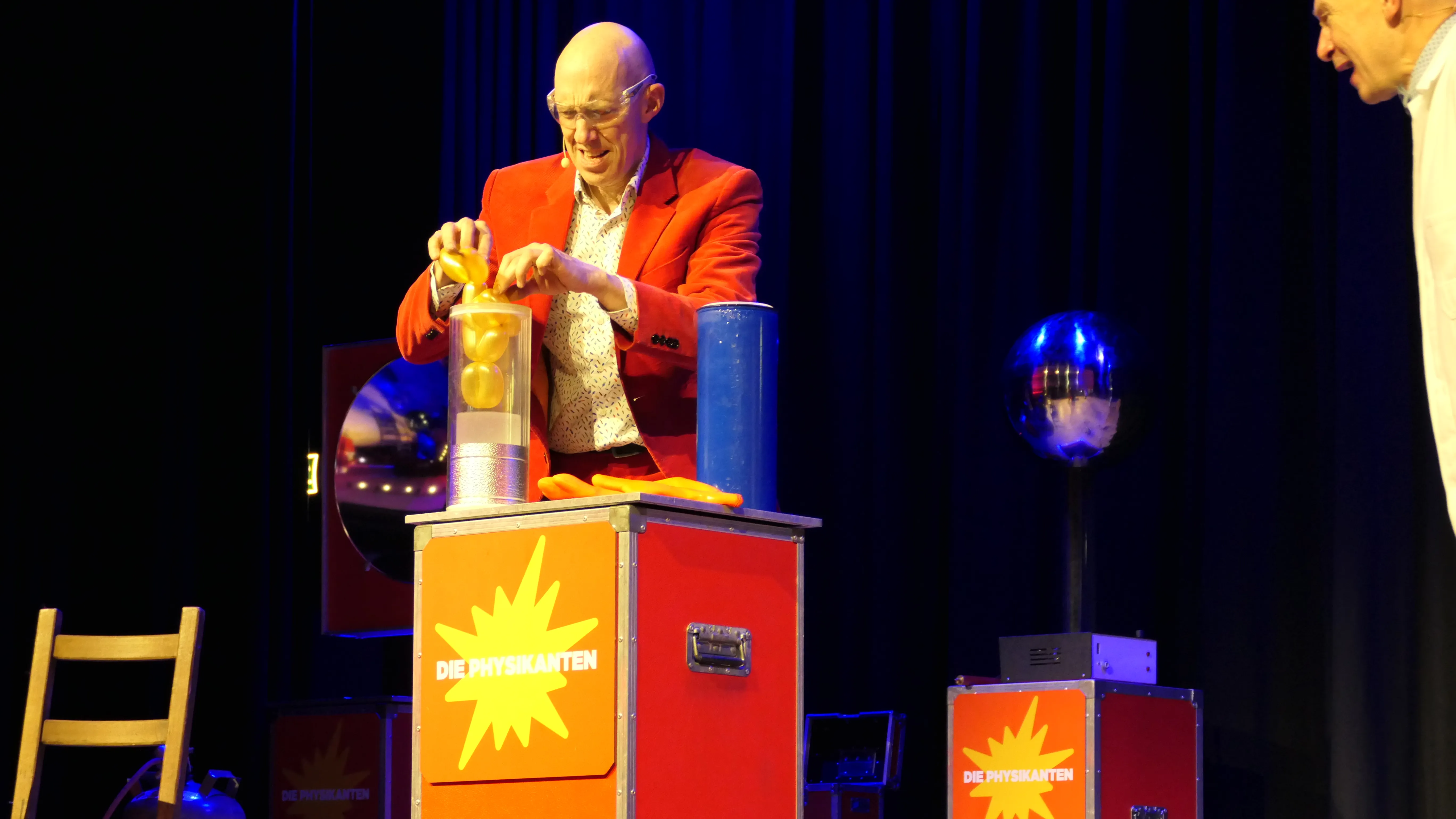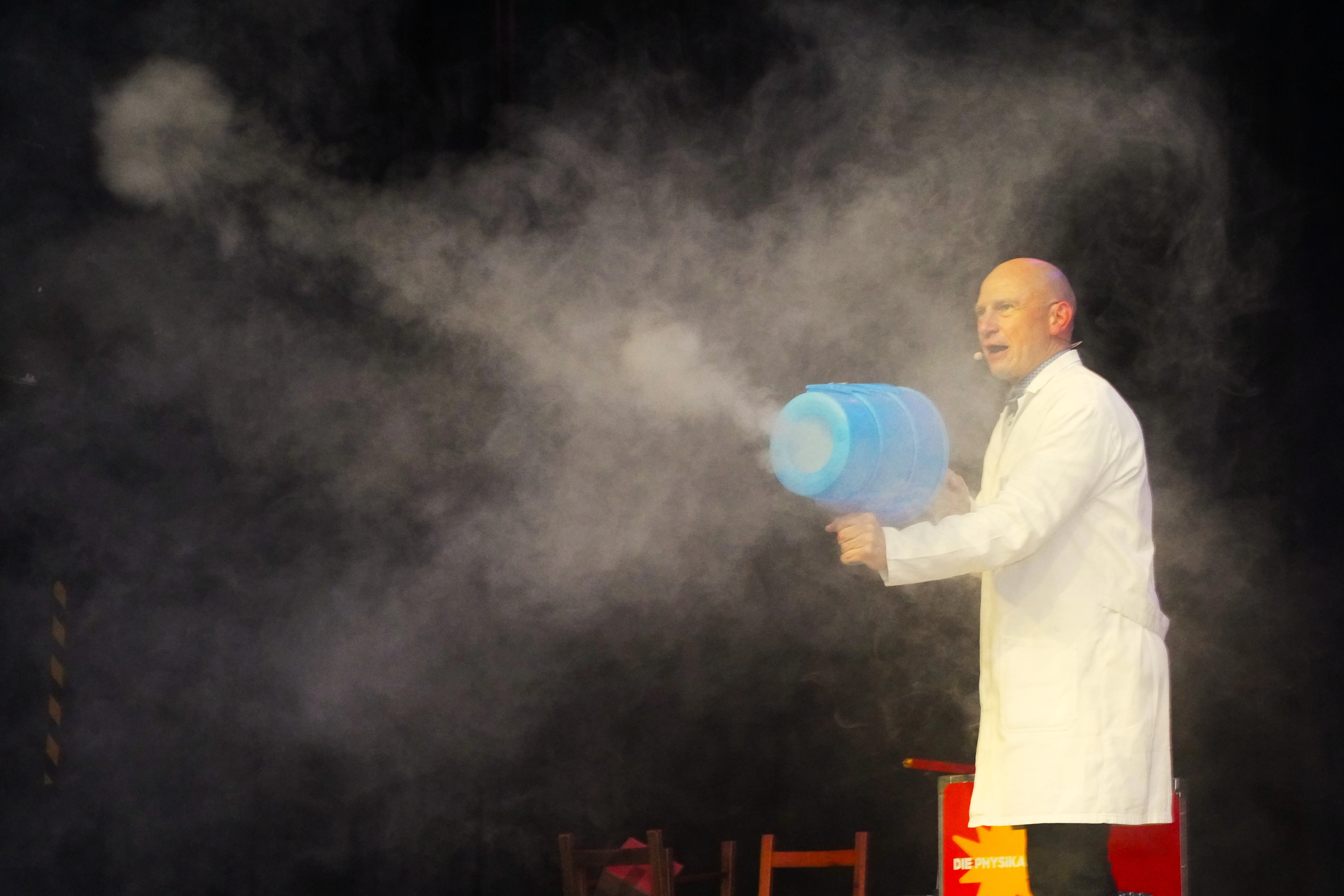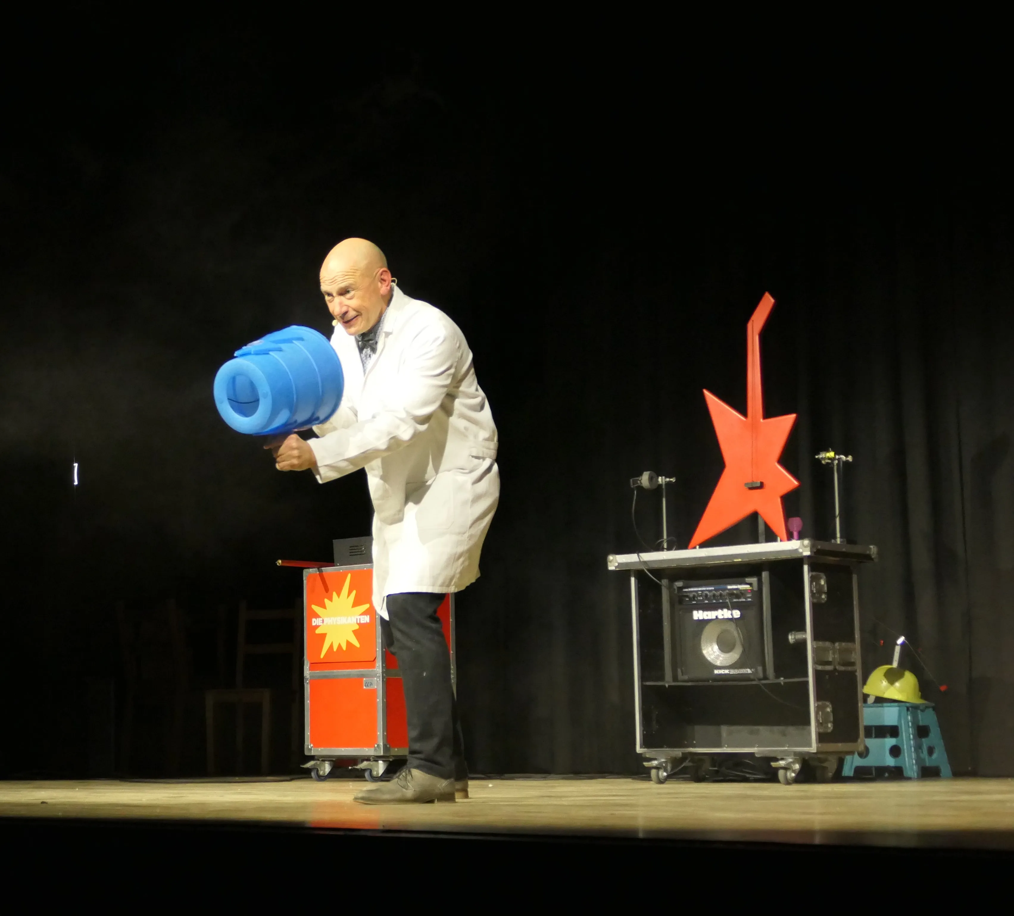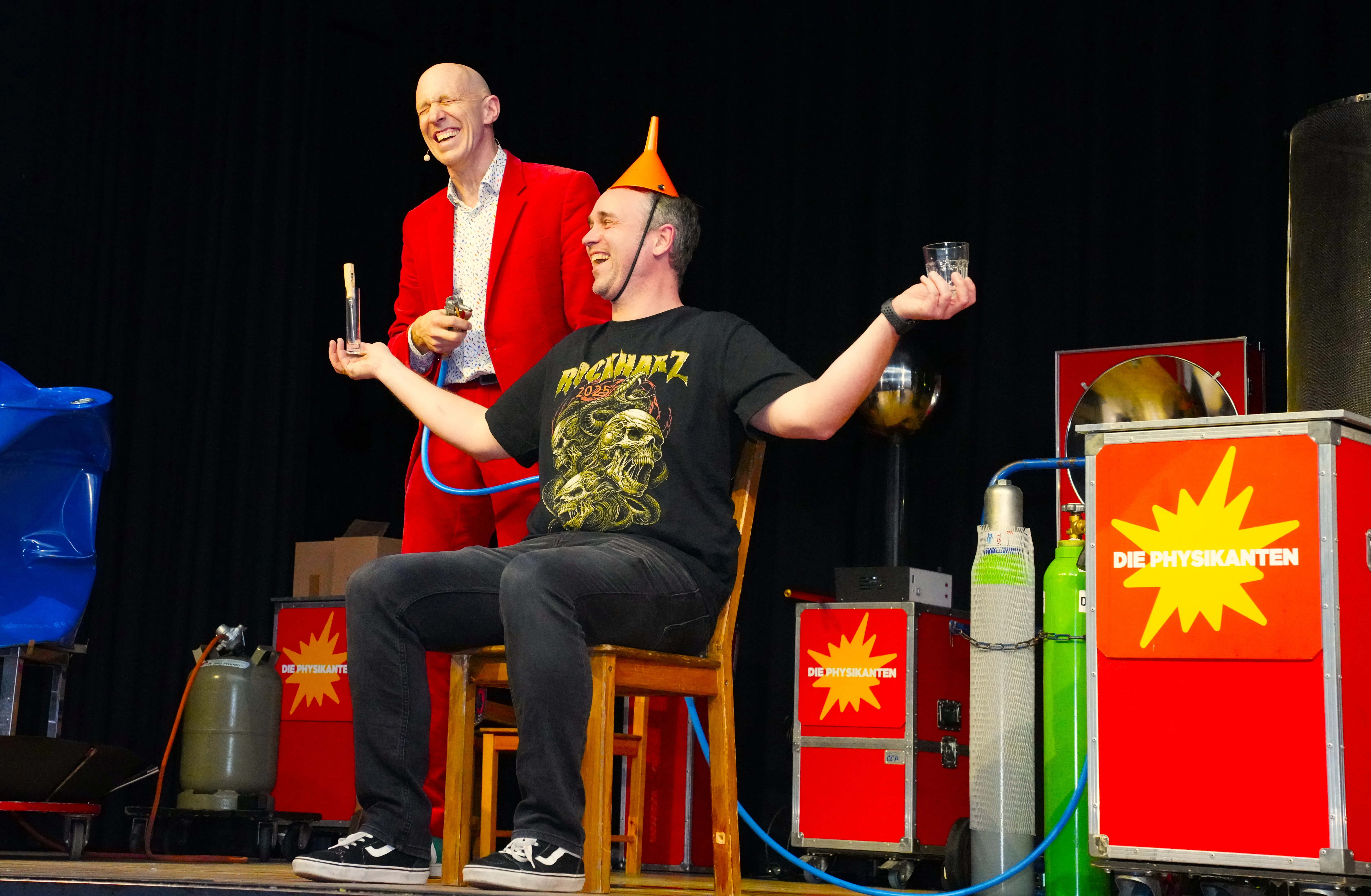 Der Diplom-Physiker Marcus Weber alias Herr Markus und der Schauspieler Hartmut Lehnert alias Professor Dr. Liebermann zogen alle Register der Physik, um diese anschaulich auf der Bühne zu präsentieren. „Learning by burning“ lautete die Begrüßung der zwei Akteure. Es bedeutet auf Deutsch wörtlich „Lernen durch Verbrennen“ Aber so weit kam es an diesem Abend nicht.