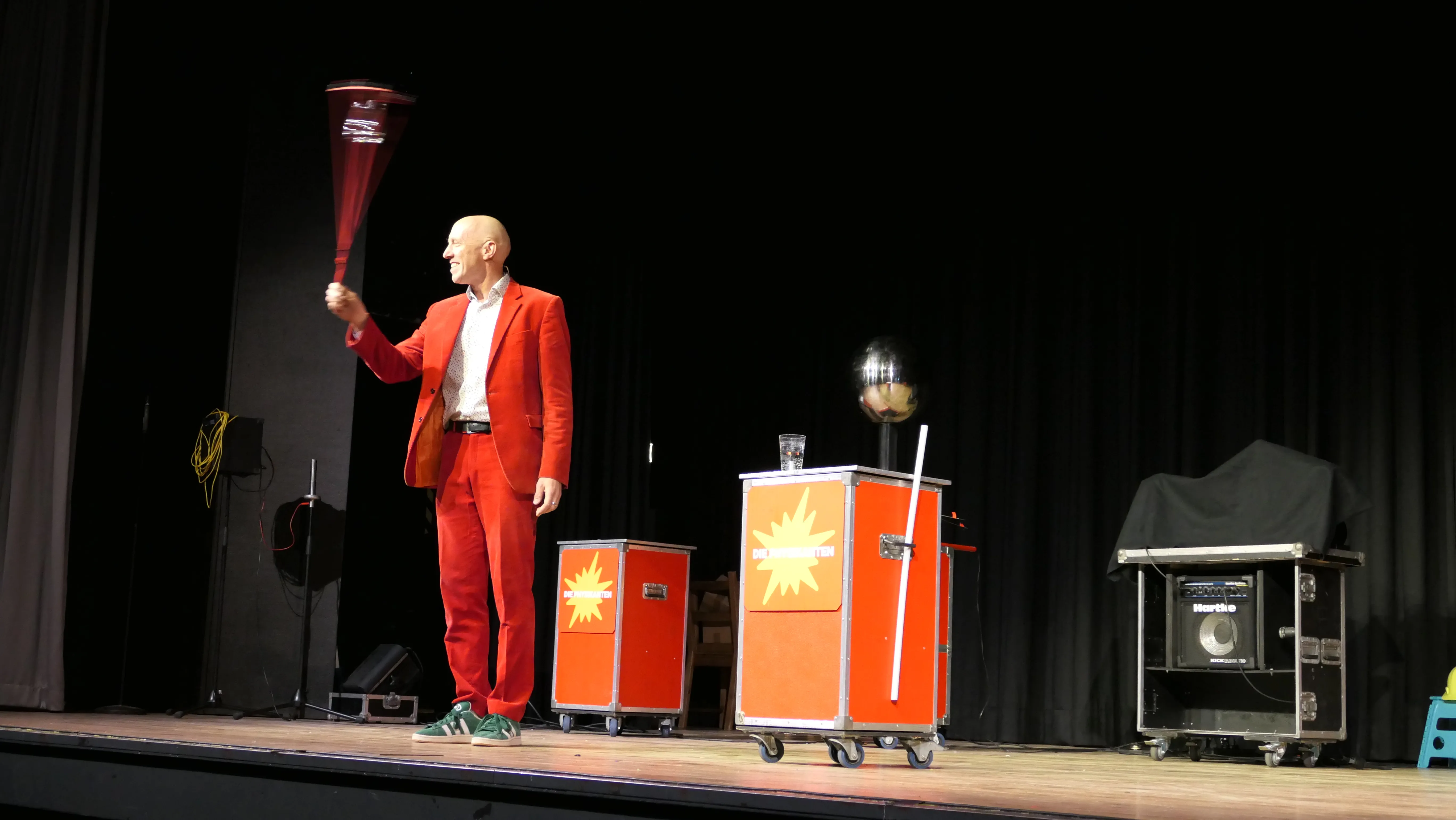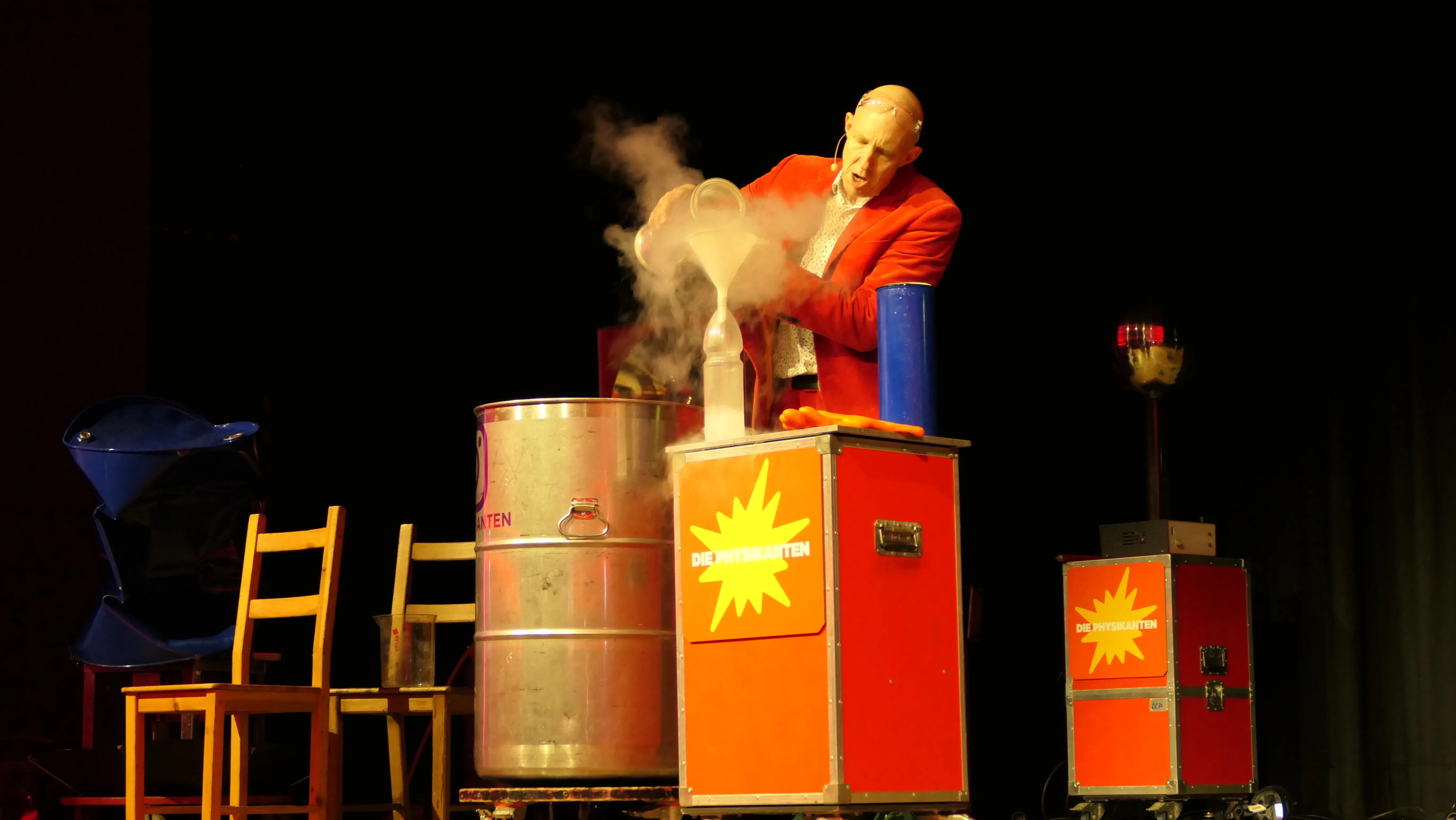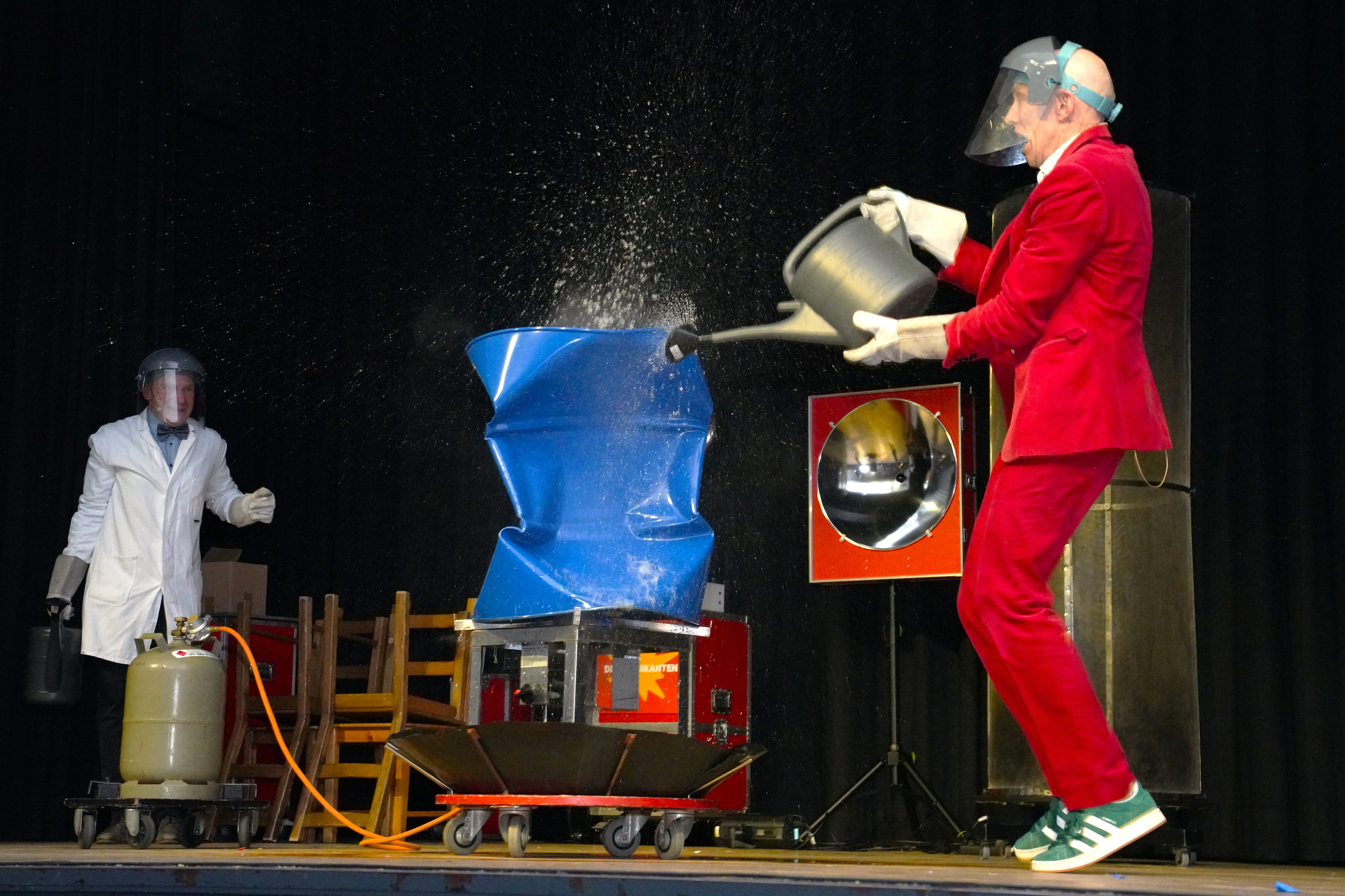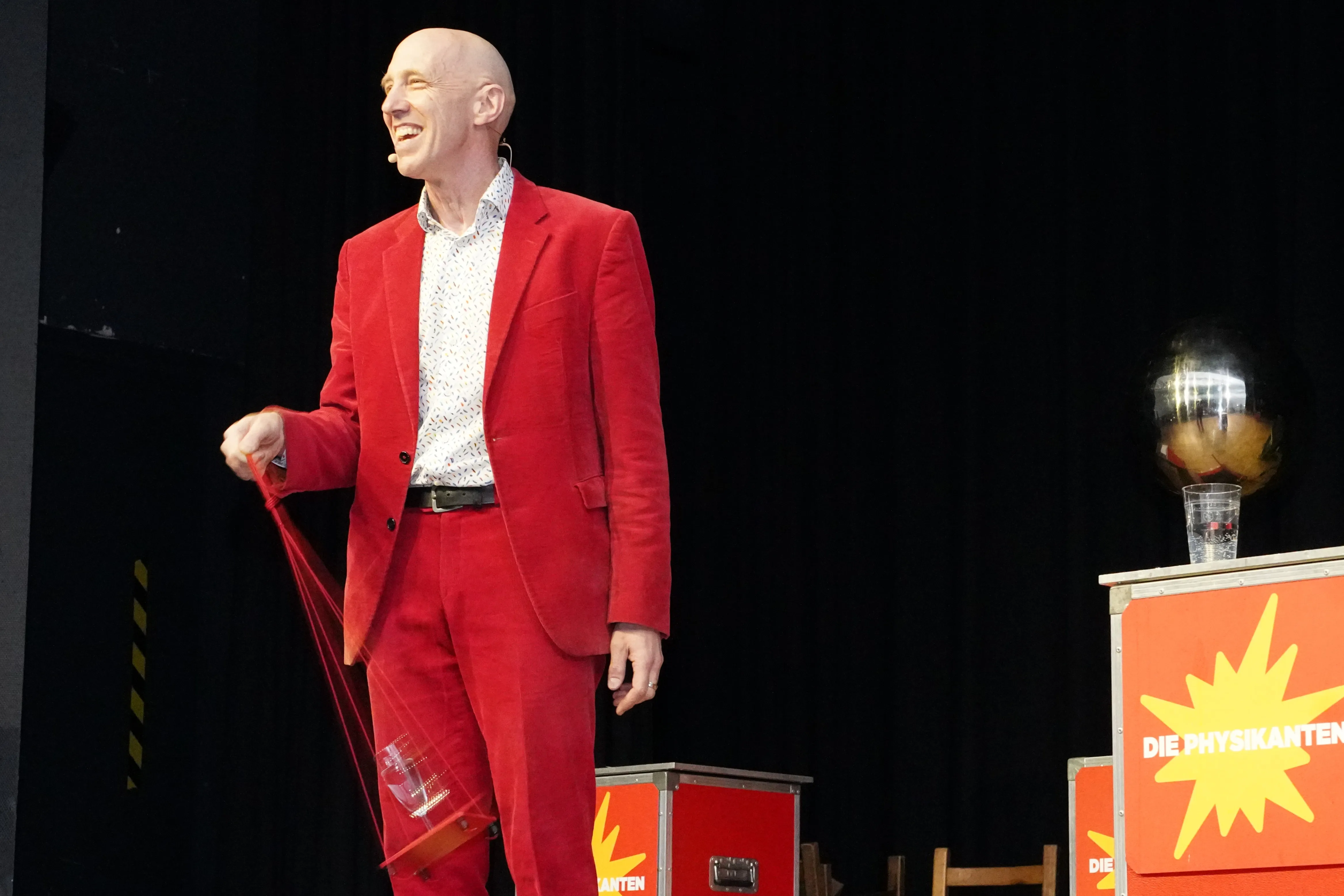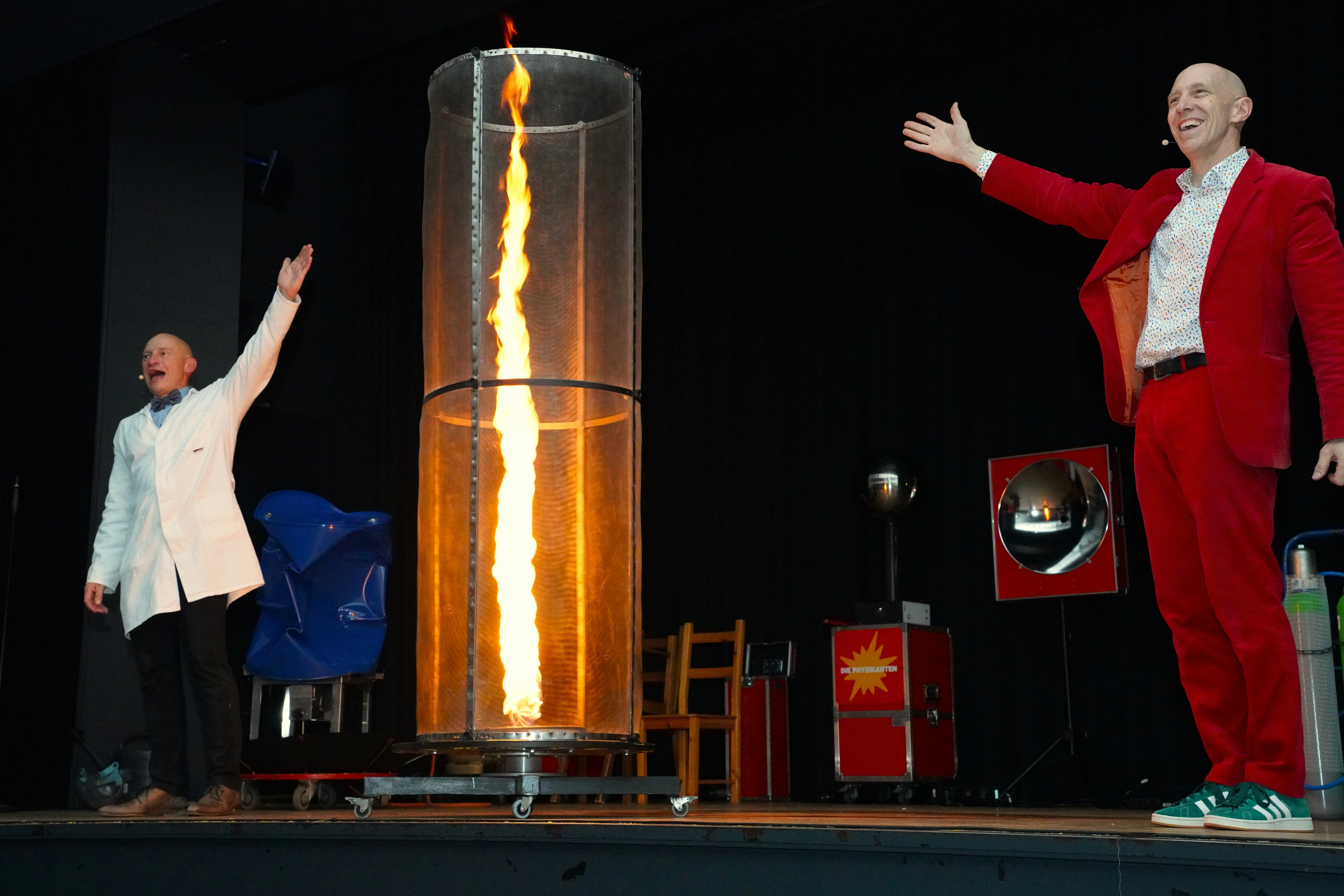 Der Diplom-Physiker Marcus Weber alias Herr Markus und der Schauspieler Hartmut Lehnert alias Professor Dr. Liebermann zogen alle Register der Physik, um diese anschaulich auf der Bühne zu präsentieren. „Learning by burning“ lautete die Begrüßung der zwei Akteure. Es bedeutet auf Deutsch wörtlich „Lernen durch Verbrennen“ Aber so weit kam es an diesem Abend nicht.