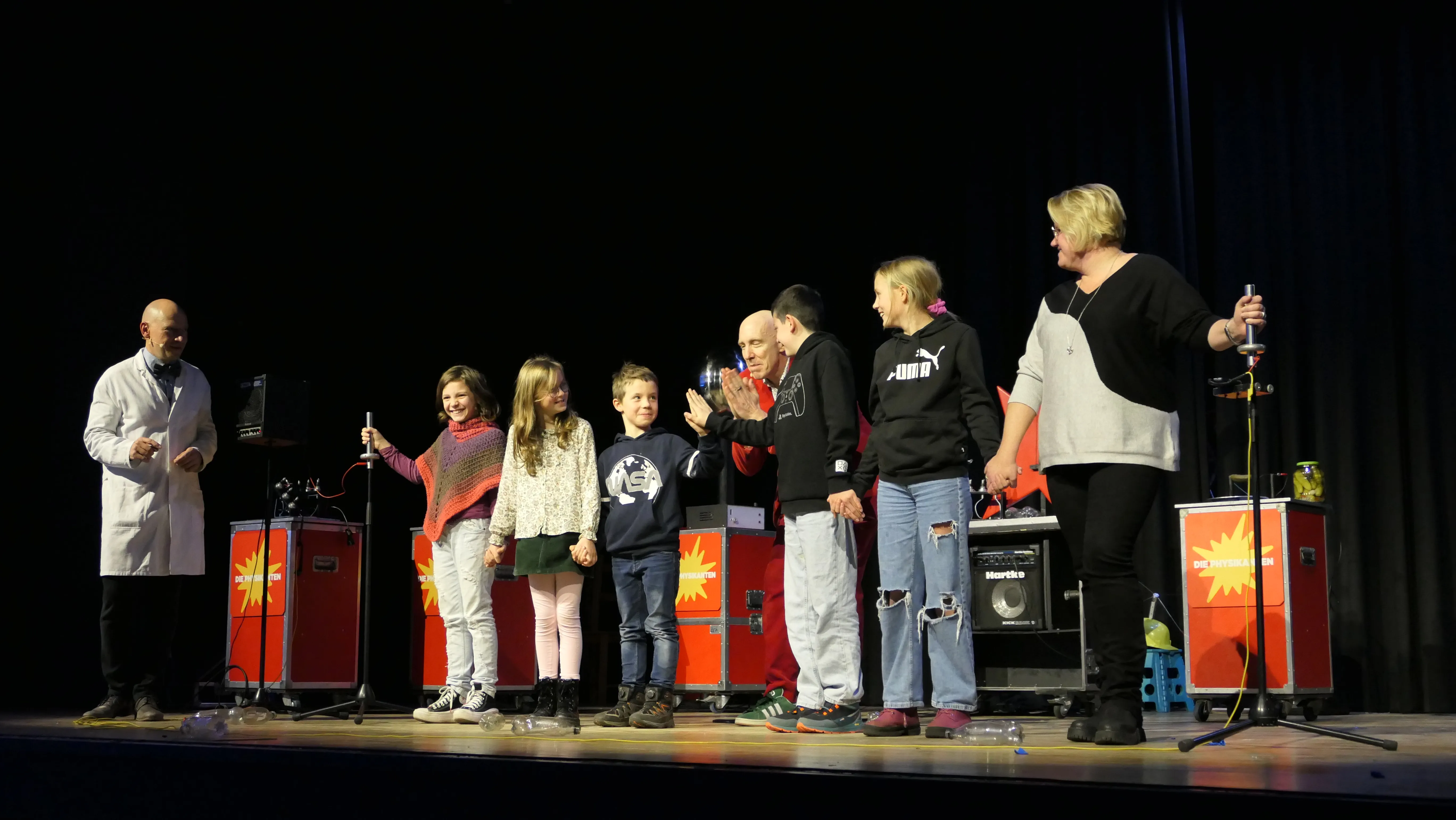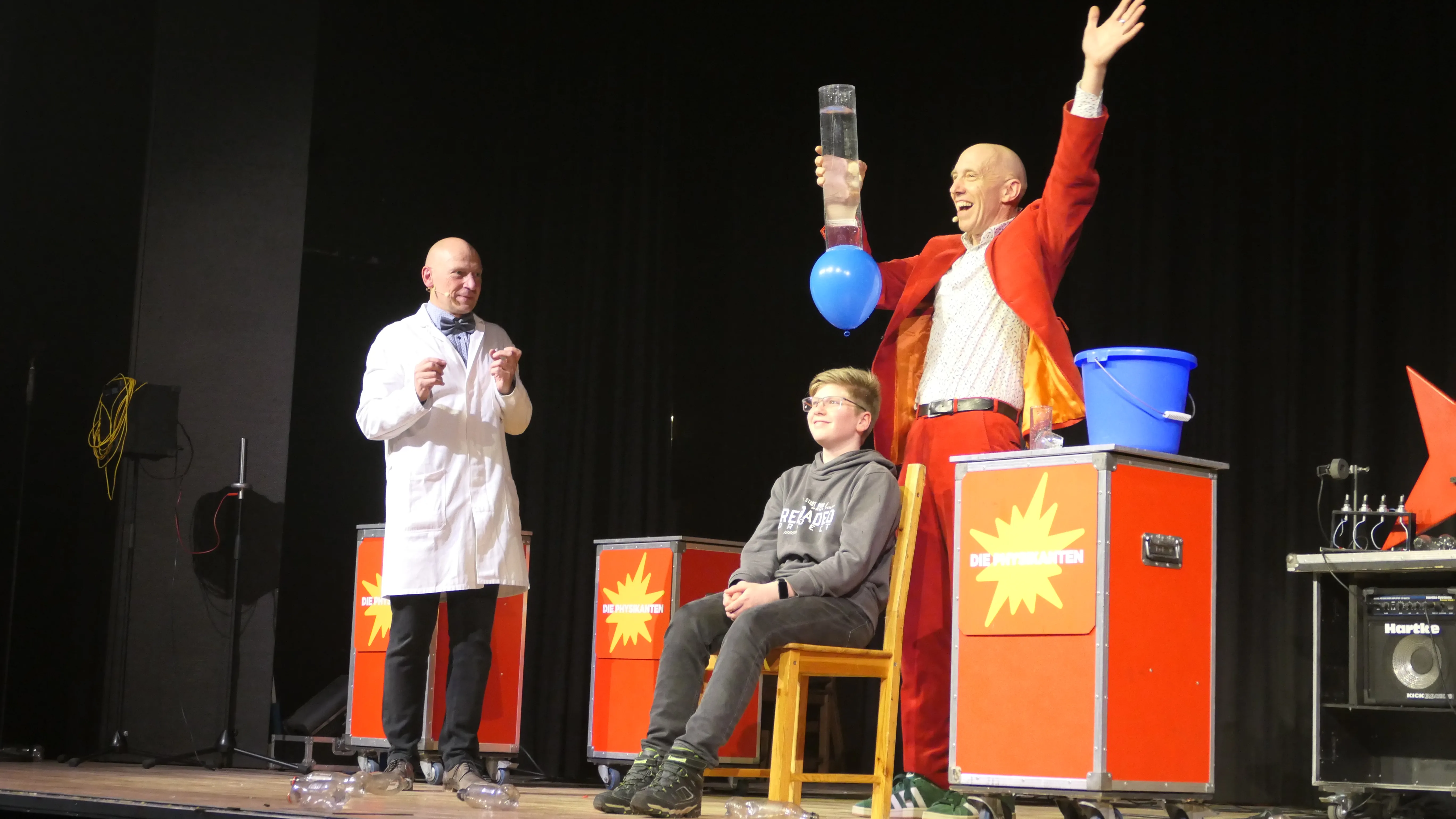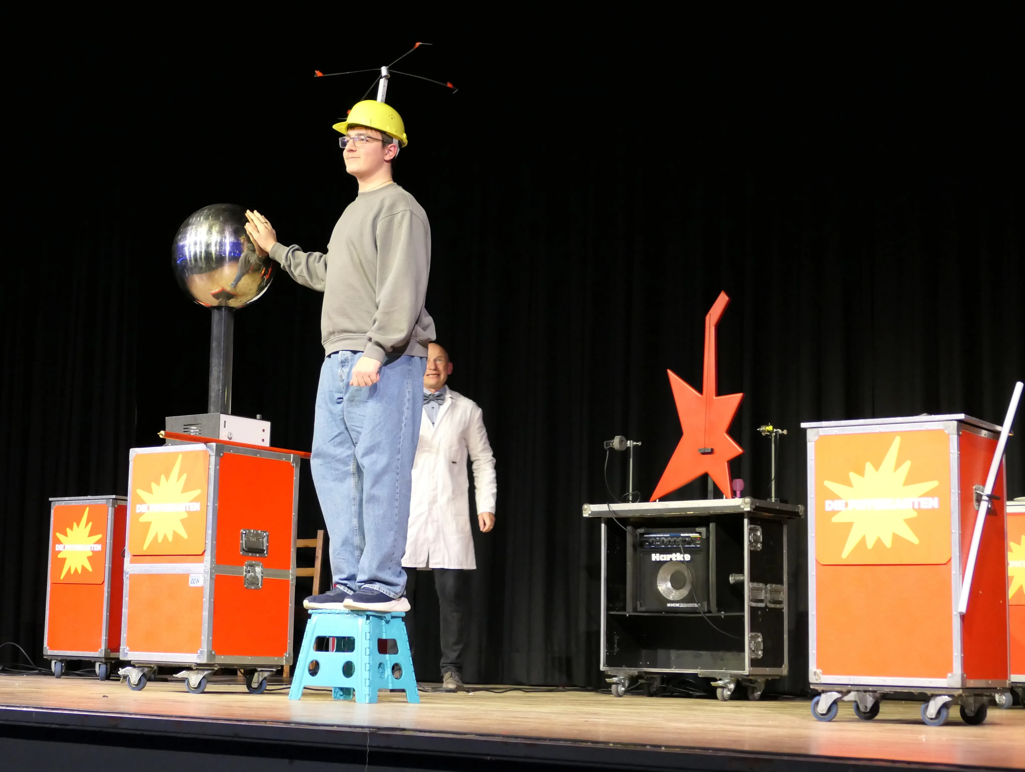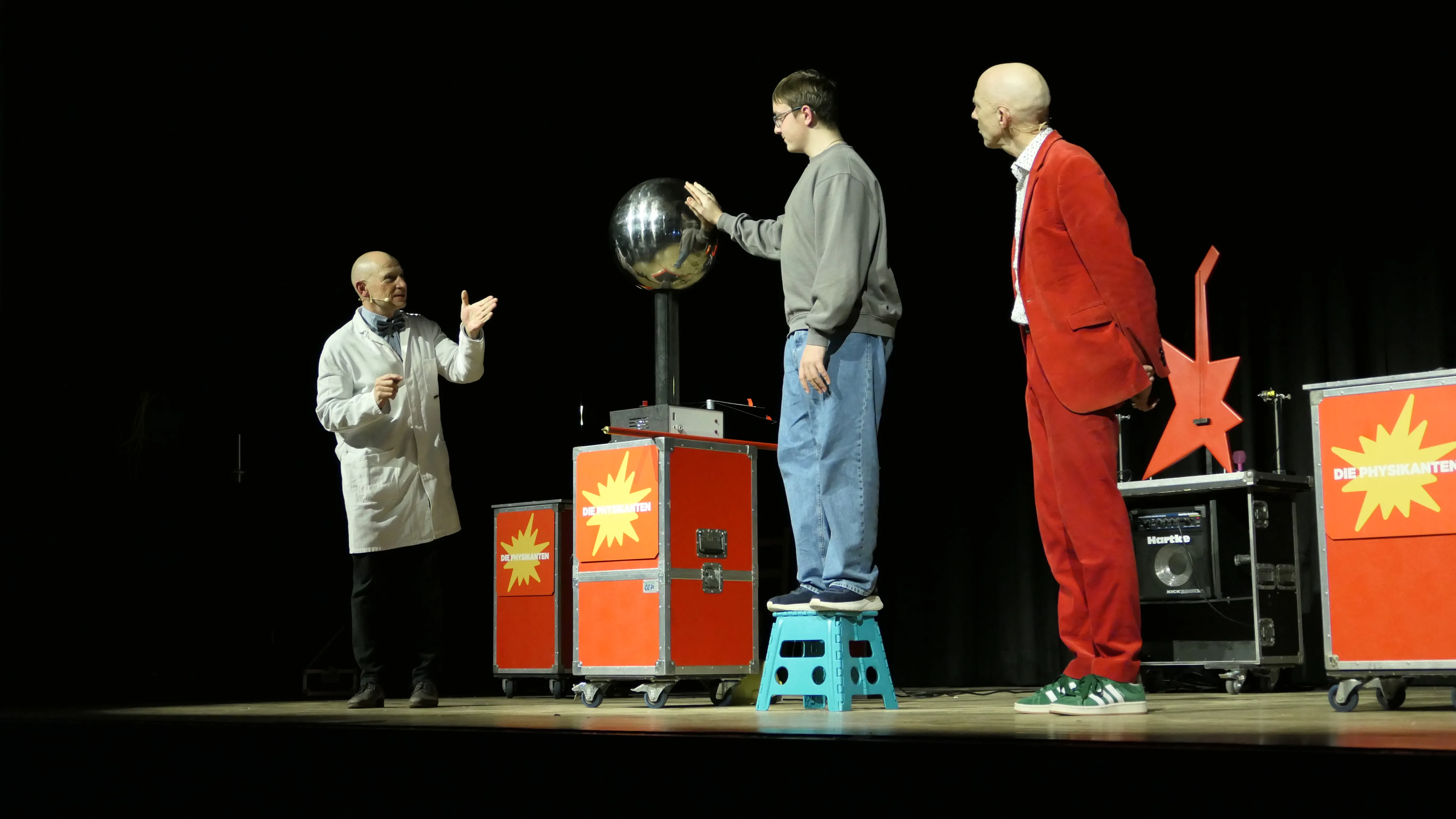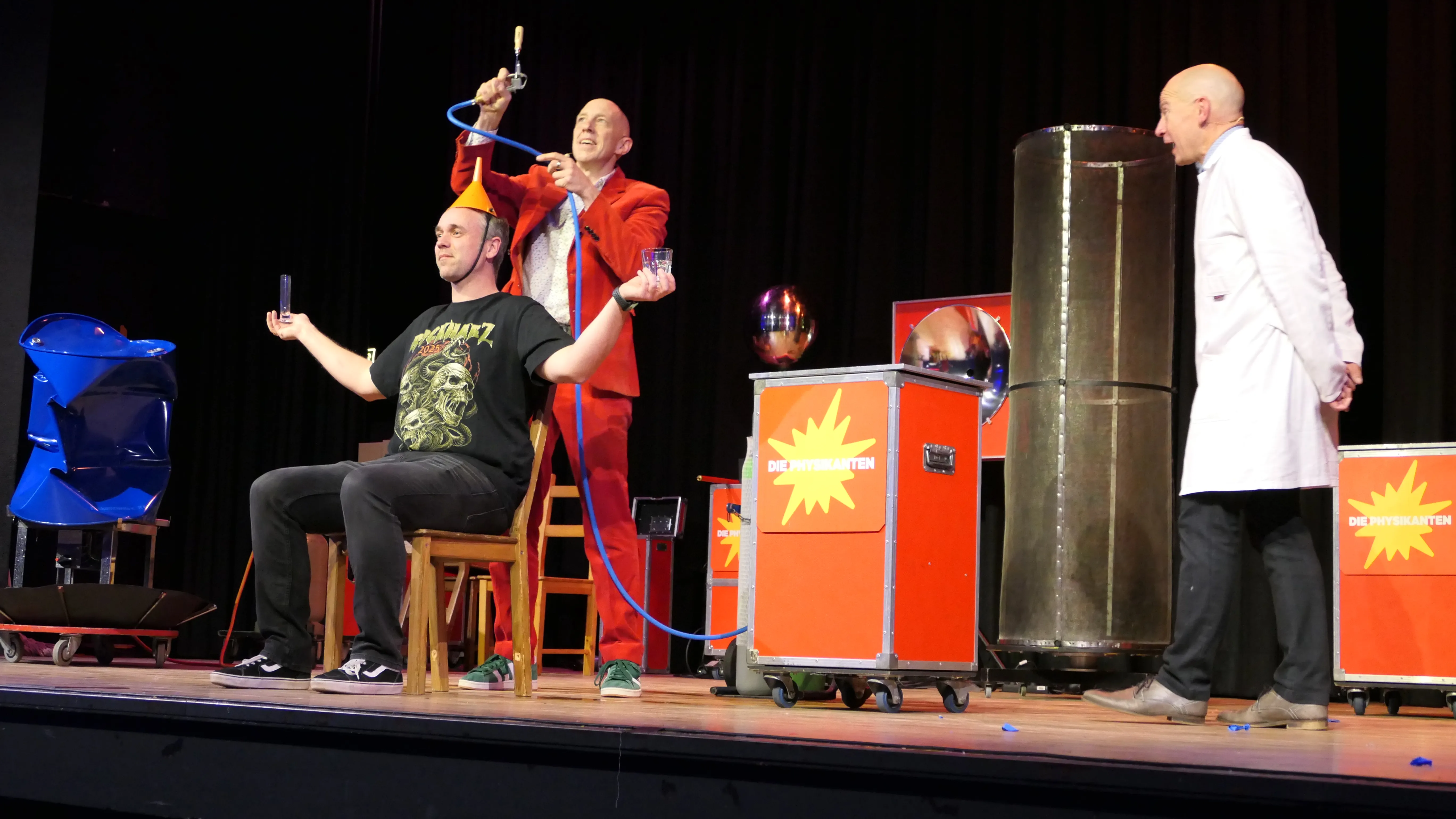 Scherzhaft stellen sie infrage, ob Thomas Edison wirklich die Glühbirne erfunden habe oder ob diese Errungenschaft nicht eigentlich „Harry von der Gurke“ zugesprochen werden müsste. Der menschliche Stromkreis wurde sehr anschaulich auf der Bühne mit einigen Freiwilligen gezeigt.