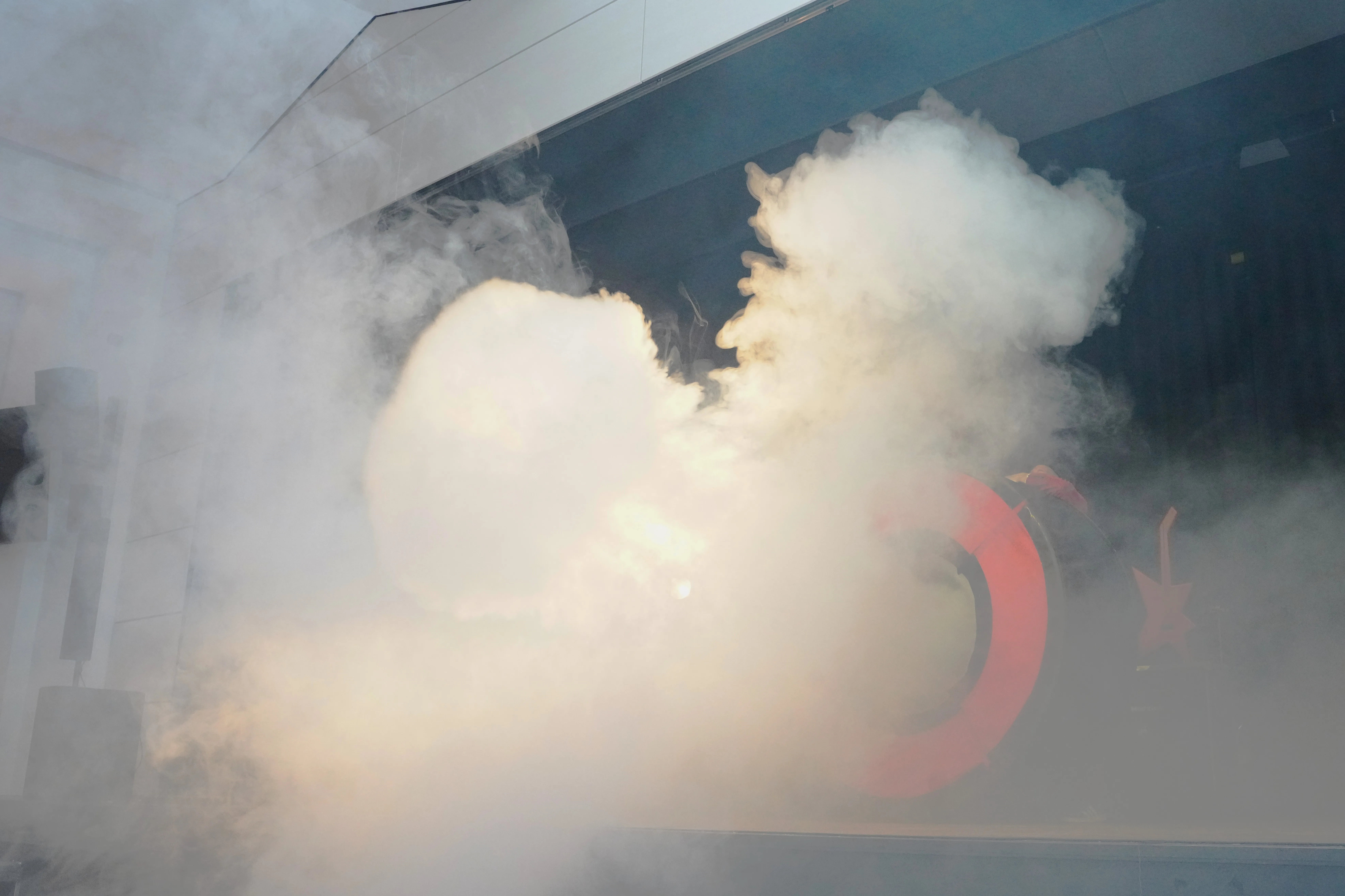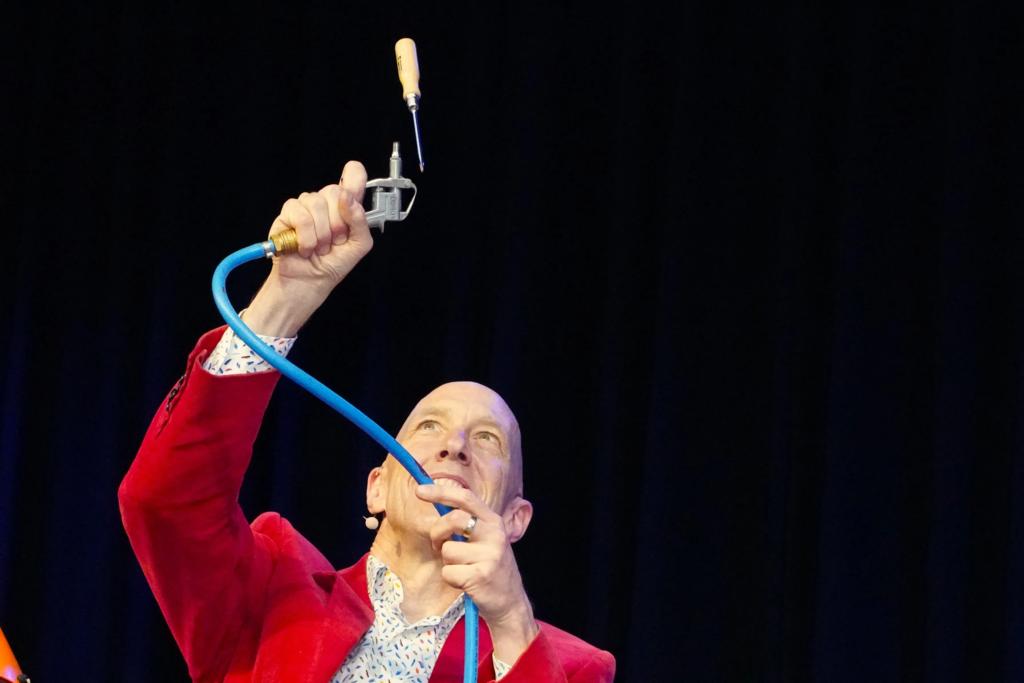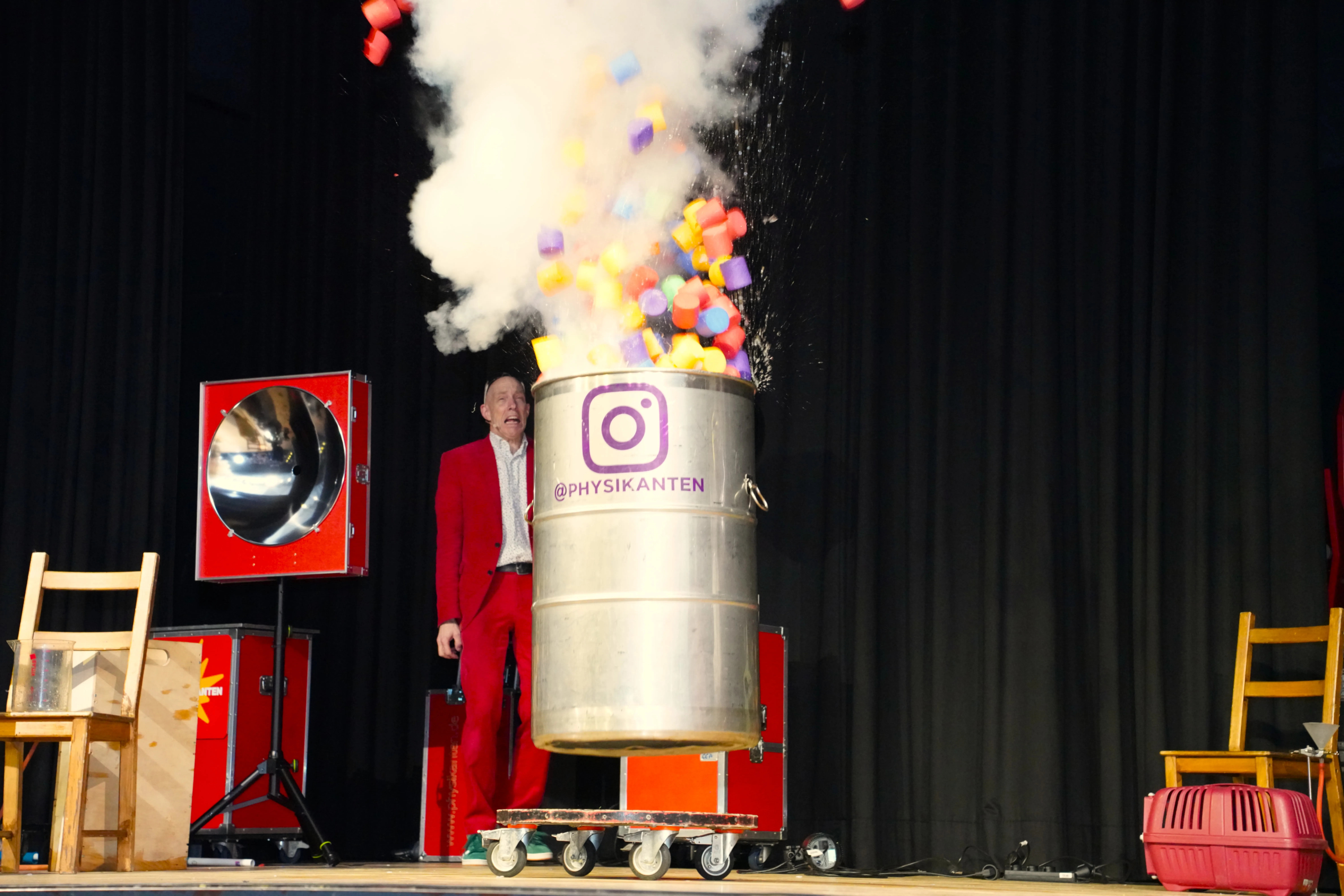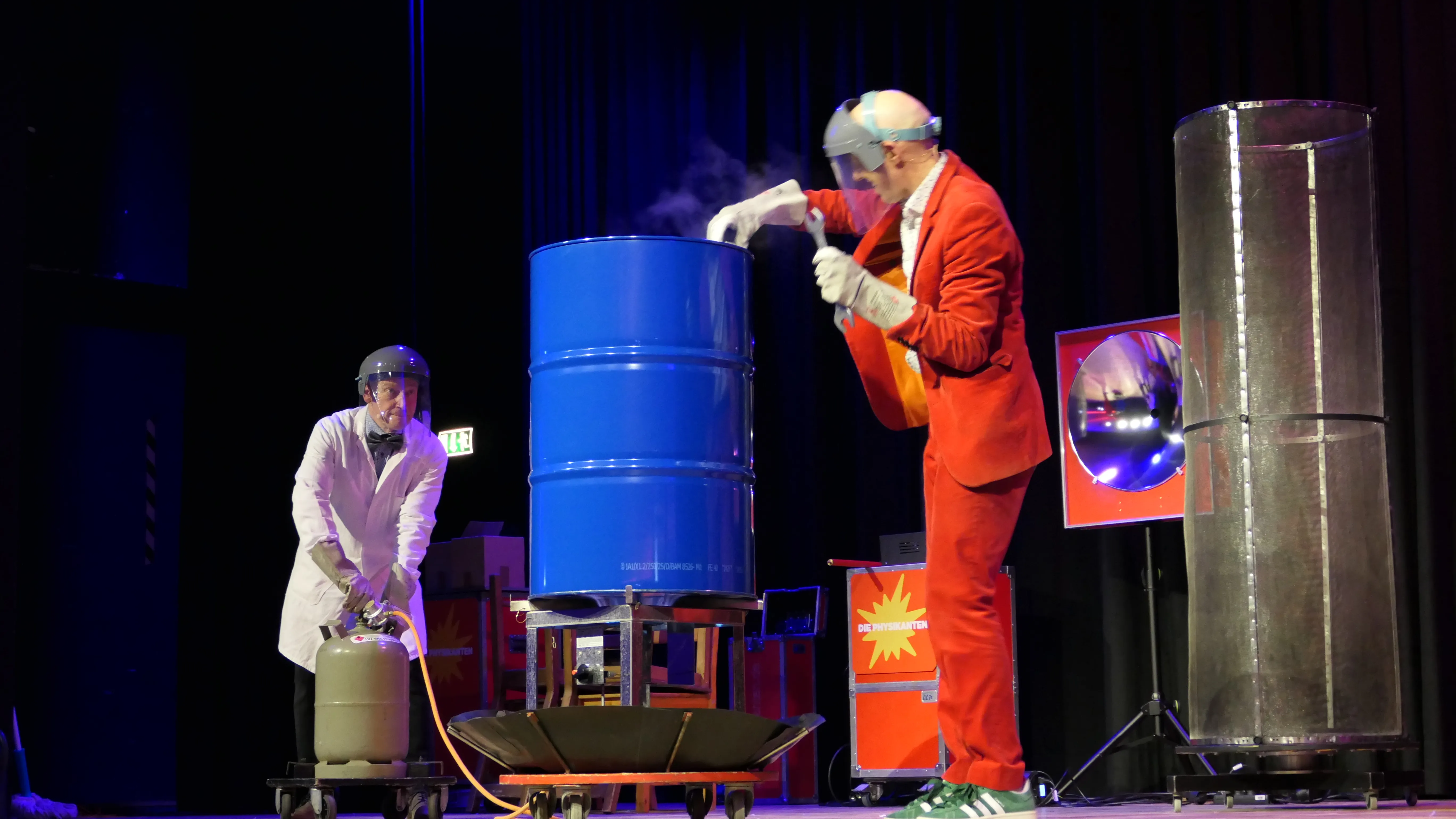 Nach einer kleinen Pause wurde das Thema Wasserstoff aufgegriffen, bevor es über den Prototyp einer Dampfmaschine zur sehr beeindruckenden Implosion eines Blechfasses auf der Bühne kam. Druckluft ließ einen Ball jonglieren und ein Schraubendreher wurde über dem Kopf von Matthias von A nach B befördert. Atemberaubend!
