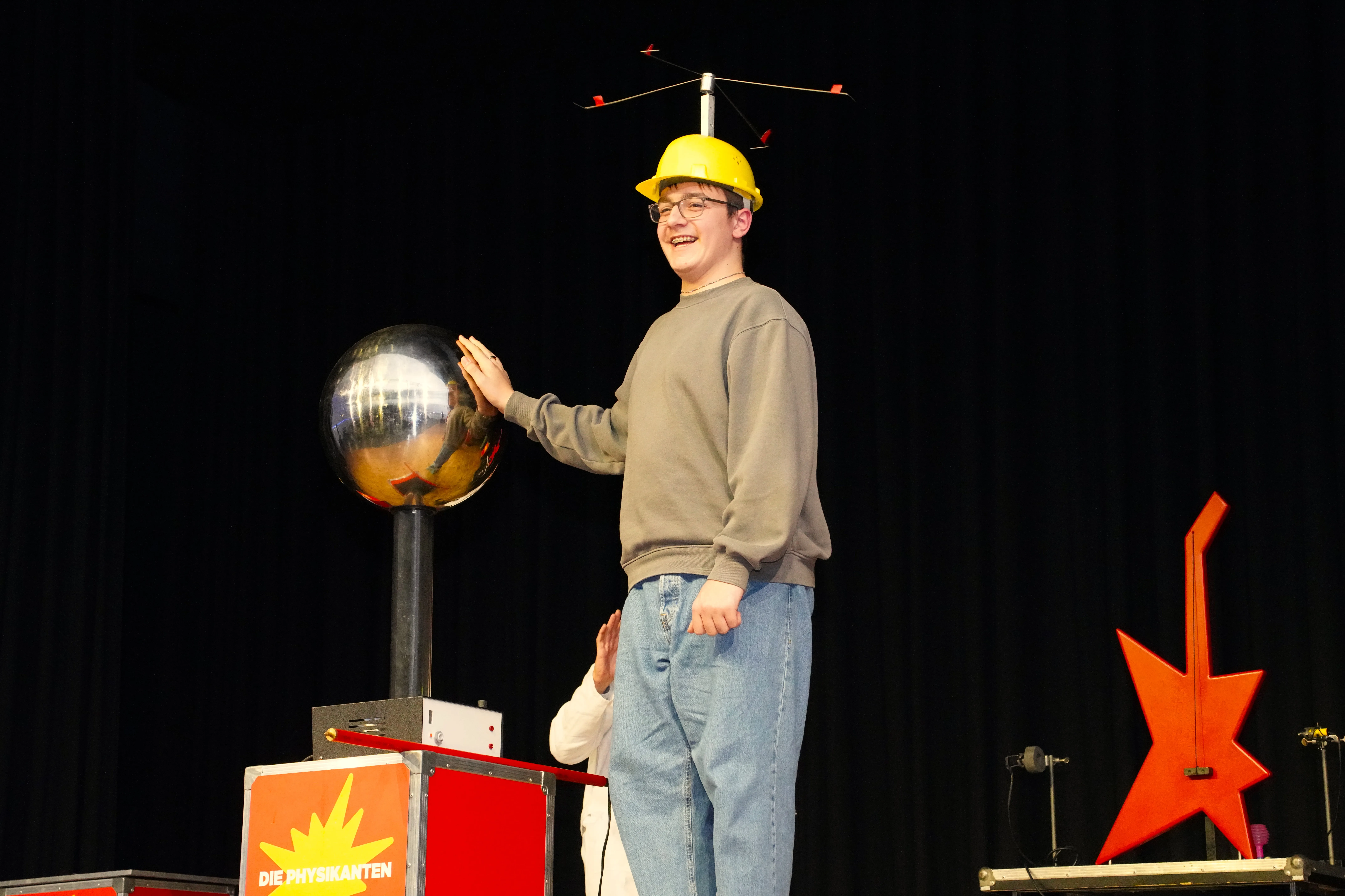 Es ging los mit Beispielen zur Rotationslehre und zur Strömungsdynamik. Das Wasserglas, das trotz einer 180-Grad-Drehung bedingt durch die Fliehkraft nicht auslief. Danach das Experiment Laser trifft Solarzelle und erzeugt Töne, anschließend dann die Erzeugung von Elektrizität nur mit PVC-Folie, Kunststoffstab und Küchentuch. Ein langgezogenes „Aaah“ des aufmerksamen Publikums begrüßte jedes neue Experiment. Und es wurde noch etliche Male das „Aaah“ gegeben. Nikita aus dem Publikum durfte aktiv das 300.000-Volt-Gefühl genießen und erleben, wie sich der Rotor auf dem aufgesetzten Helm drehte. Felix wurde als nächster Besucher ausgewählt, an einem Unterdruckexperiment teilzunehmen. Herr Marcus und der Professor löschten Kerzen mit Luftdruck, veranschaulichten die Funktionsweise eines Motors.
