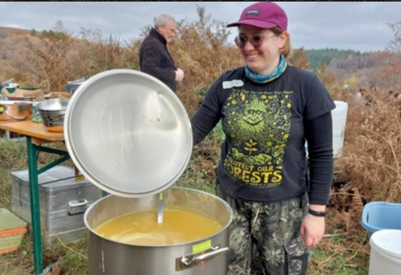 Als die Gruppe das Waldstück erreichte, lag noch feiner Nebel zwischen den Bäumen. Nach einer kurzen Begrüßung durch die Projektverantwortlichen erklärte ihnen ein Förster und Fachmann die Handhabung des Werkzeugs — der sogenannten Widehopfhaue. Dann ging es in kleinen Teams ans Pflanzen.