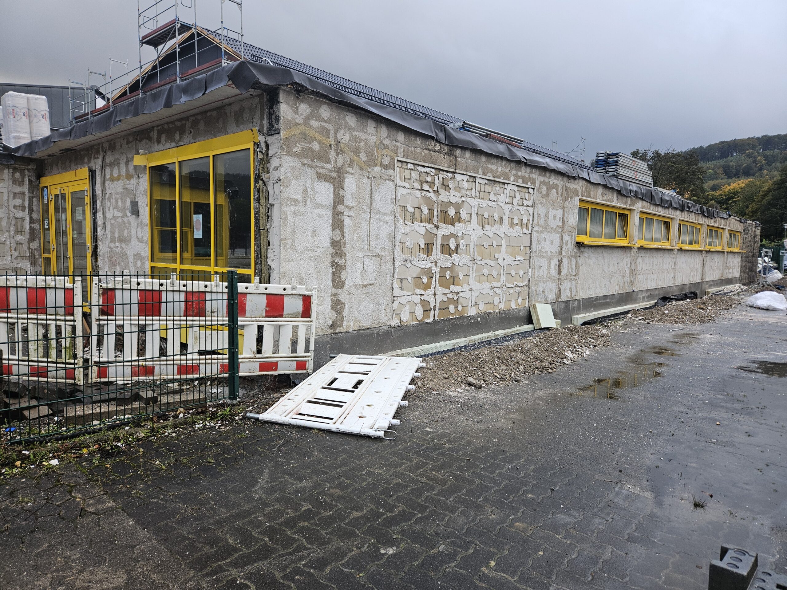Außen wurde die Fassade des Stiefelgangs freigelegt. Mittwoch kommen die neuen Fenster und dann kann mit der Dämmung und dem neuen Verputzen begonnen werden. „Aber das Dach ist fertig“, freut sich die Ingenieurin. Und auch schon der Teil der Fassade zwischen Gebäude Stiefelgang/Umkleiden und Schwimmhalle. „Das mussten wir schon machen, da das neue Dach für den vorderen Gebäudeteil daran anschließen wird“, erklärte Groß, dort wird es nämlich nicht wieder ein Flachdach geben.